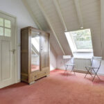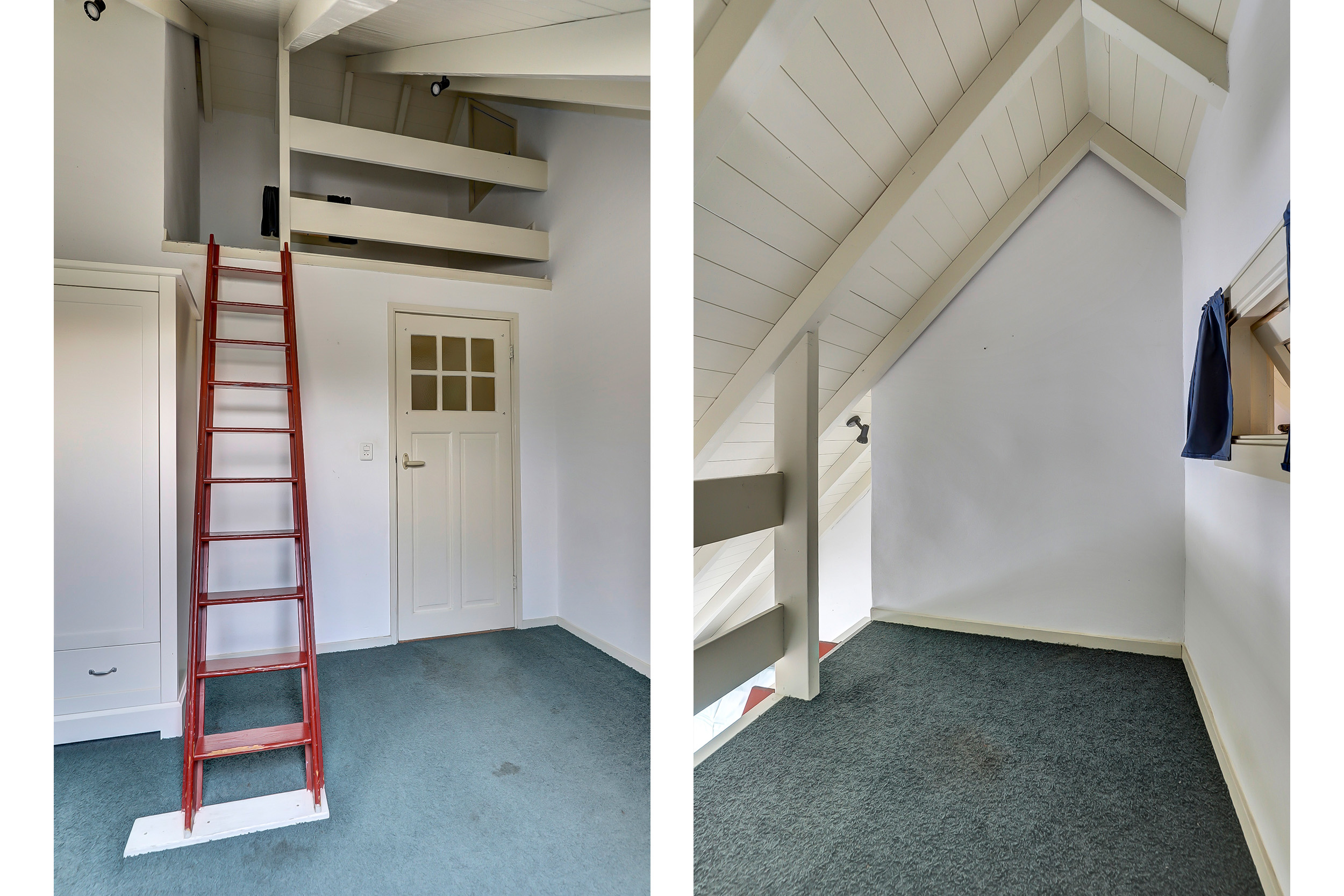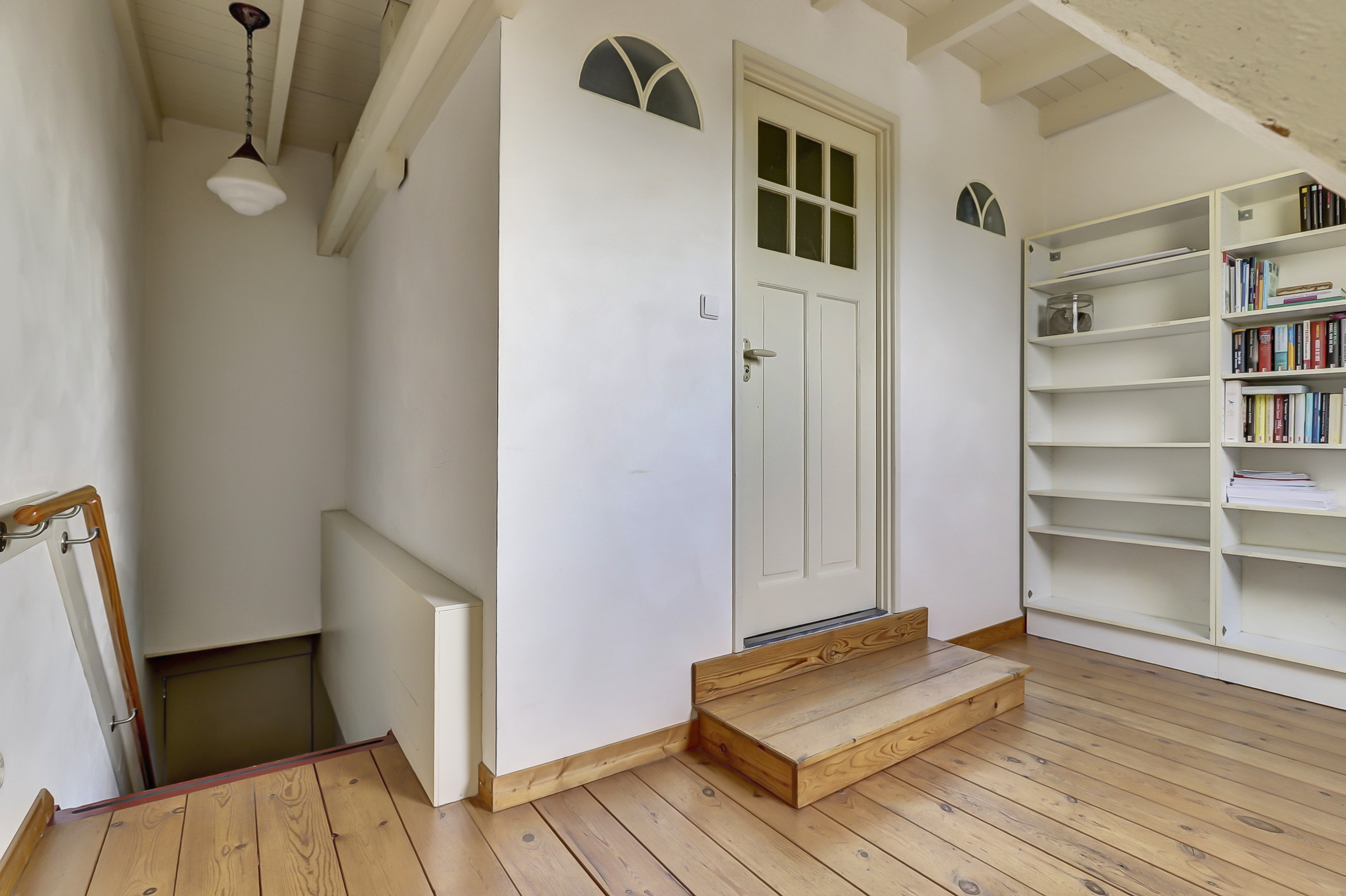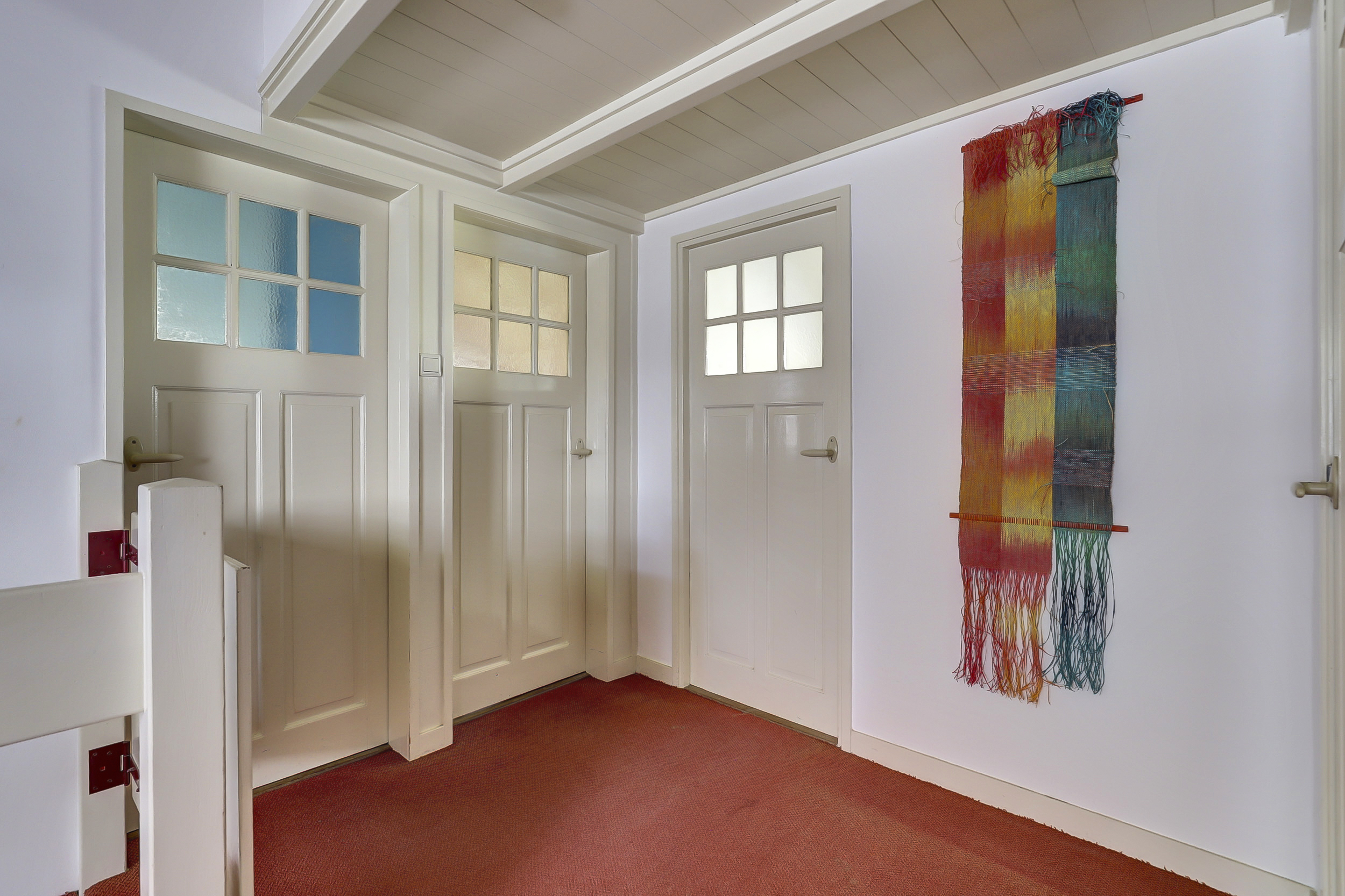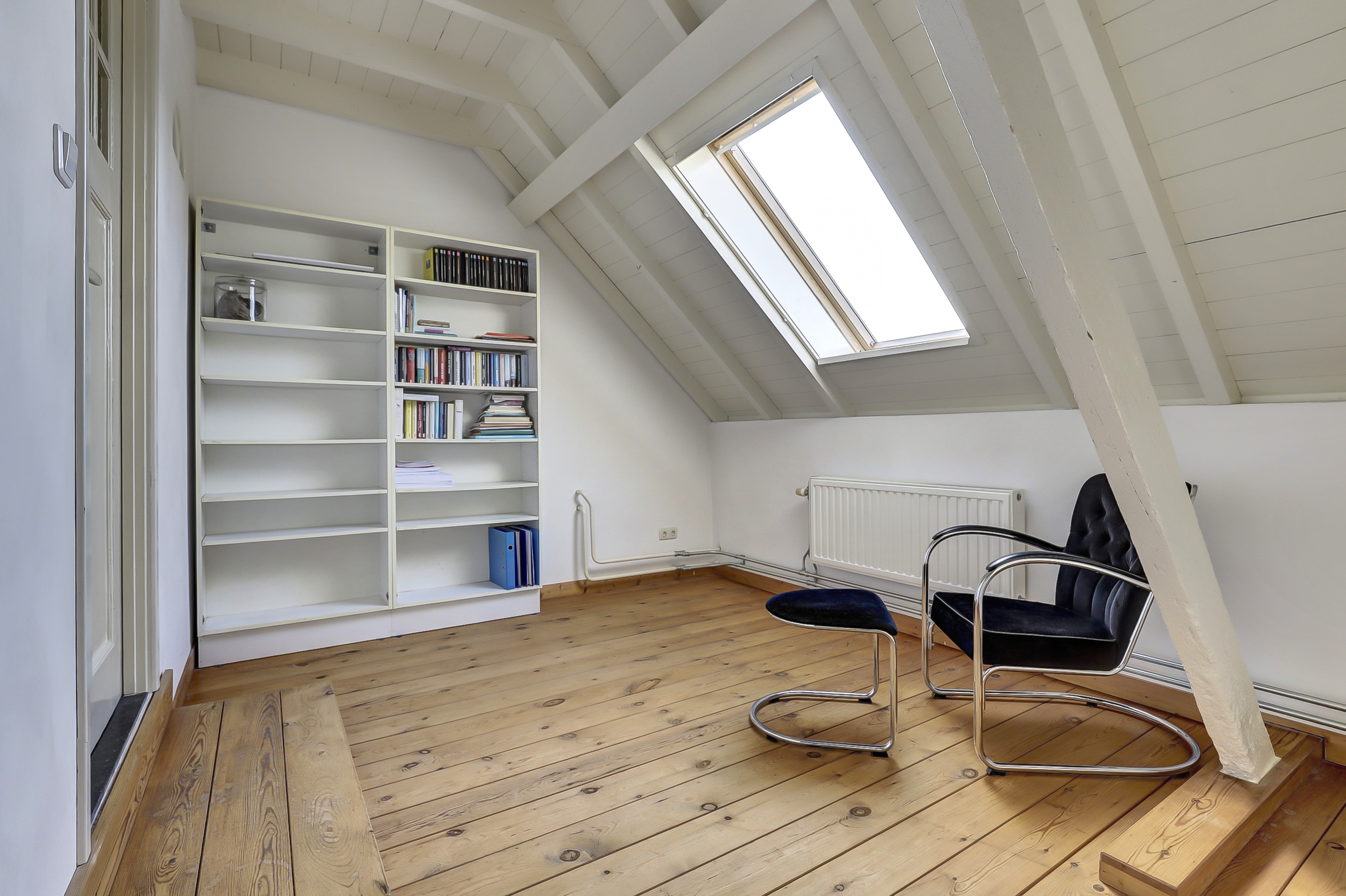 1e verdieping: overloop met cv-kast, 2 ruim bemeten slaapkamers aan de voorzijde en een 3e slaapkamer met een slaapvide. De ruime badkamer is voorzien van ligbad, toilet, douche en dubbele wastafel. Een overloop met royale master-bedroom voorzien van 2 dakramen en bergkast en met toegang tot de bergzolder en toegang tot de hobbykamer/ berging aan de achterzijde.