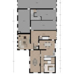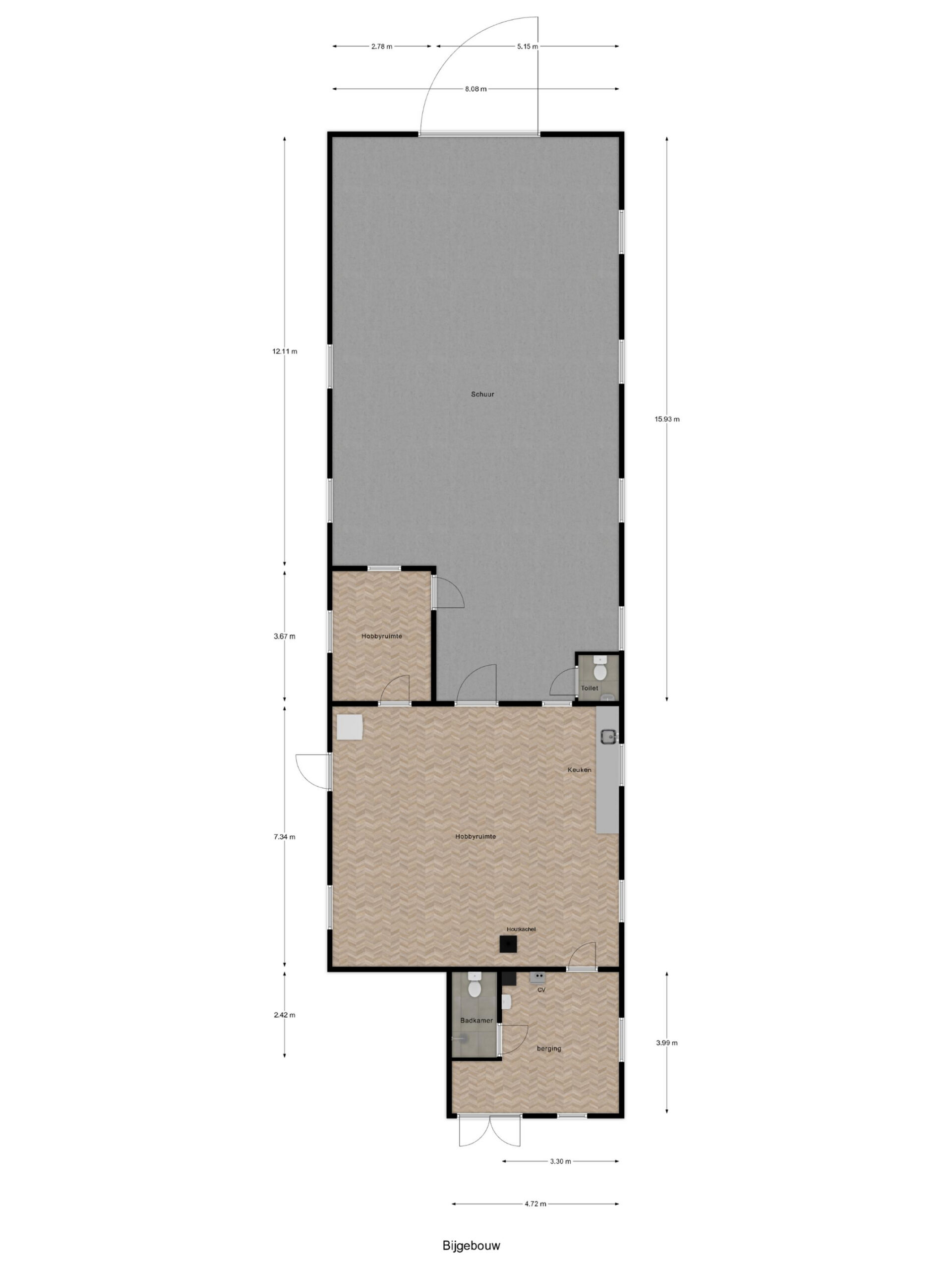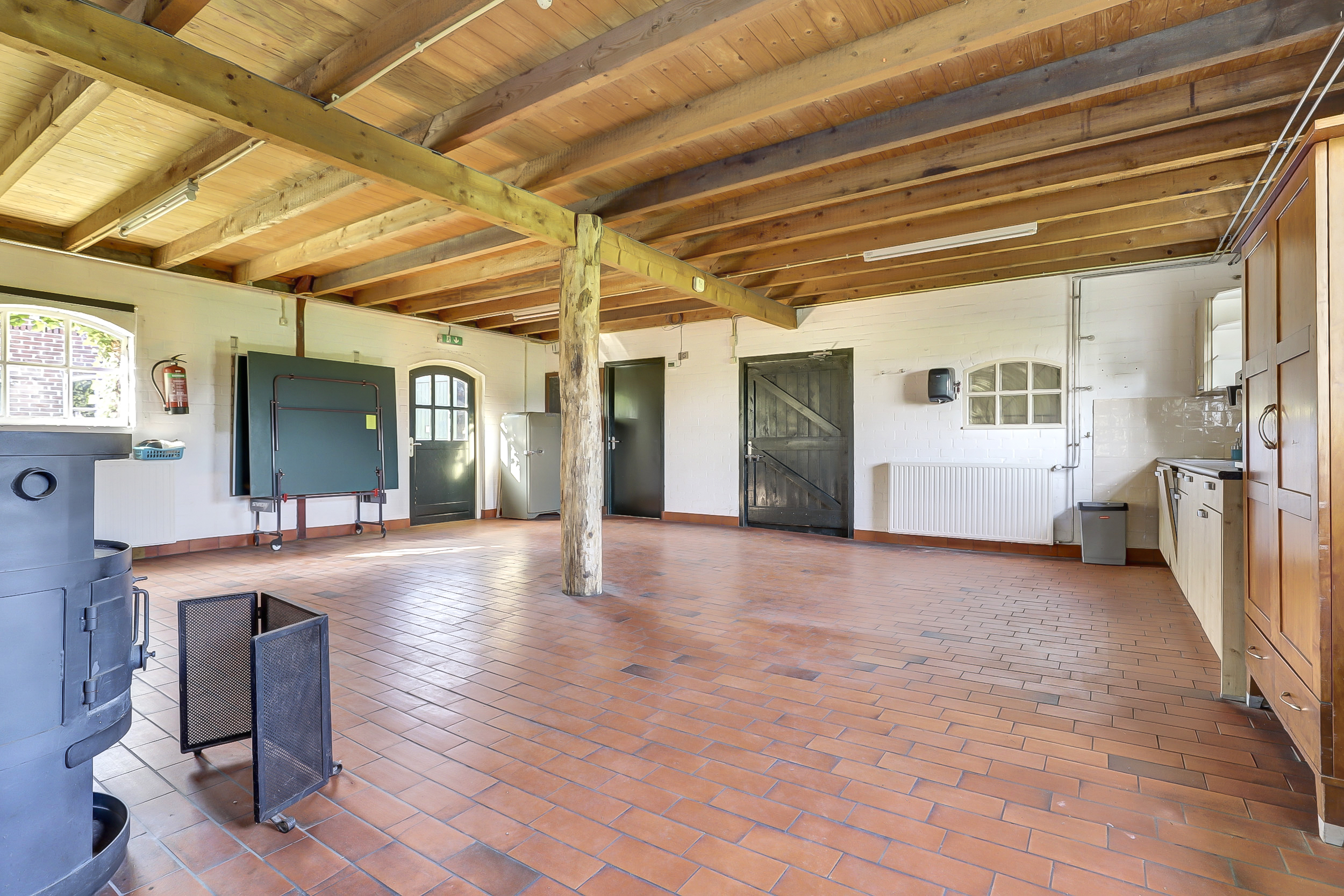 Bijgebouw bestaande uit verschillende ruimtes waaronder: multifunctionele ruimte die ingericht kan worden voor meerdere gebruikersdoeleinden zoals b.v. bijwoning of mantelzorgwoning met keukenblok, voorzien van koelkast, vaatwasser en spoelbak. Een aparte douche en toiletruimte en aan de achterzijde een stalruimte met toilet.
