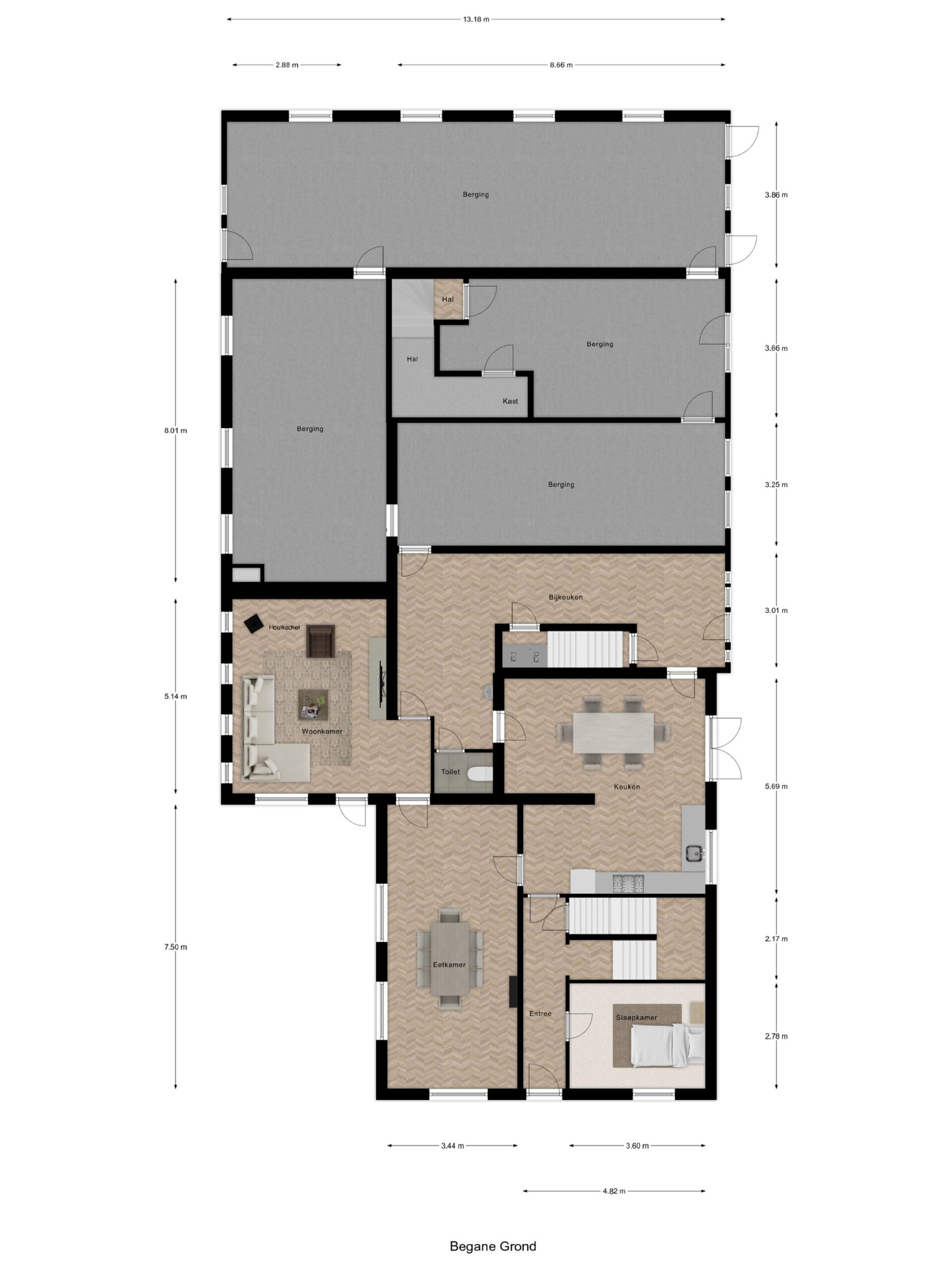 Entree/ hal, toegang tot de kelder. Een aan de voorzijde gelegen slaap-/ werkkamer. De woonkamer met veel lichtinval met toegang tot een extra werkkamer/ kantoor. Verder een gezellige woonkeuken met keuken in hoekopstelling en inbouwapparatuur, deze ruimte biedt middels openslaande tuindeuren toegang tot het terras, een riante bijkeuken met witgoedaansluitingen en toiletruimte, toegang tot het achterste gedeelte van de woning bestaande uit verschillende bergruimtes en hobbyruimtes en 2e trapopgang naar de 1e verdieping.