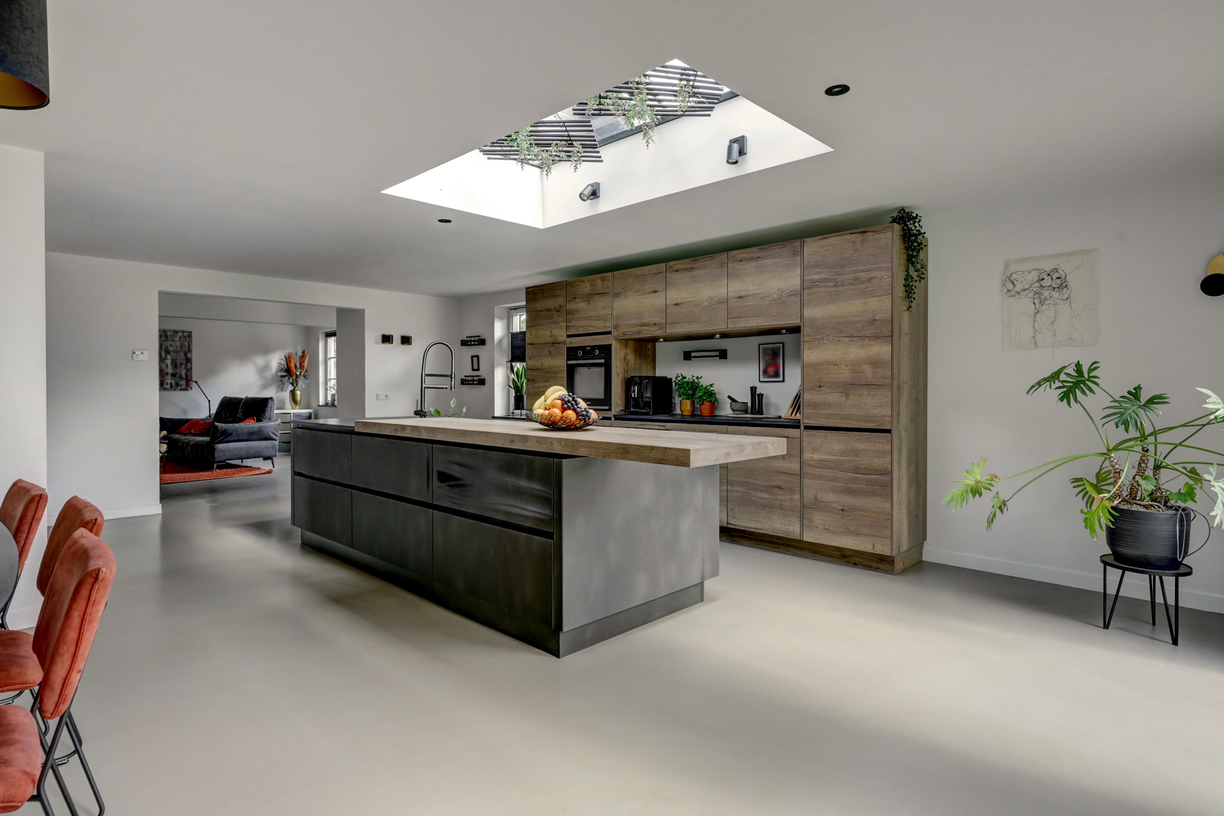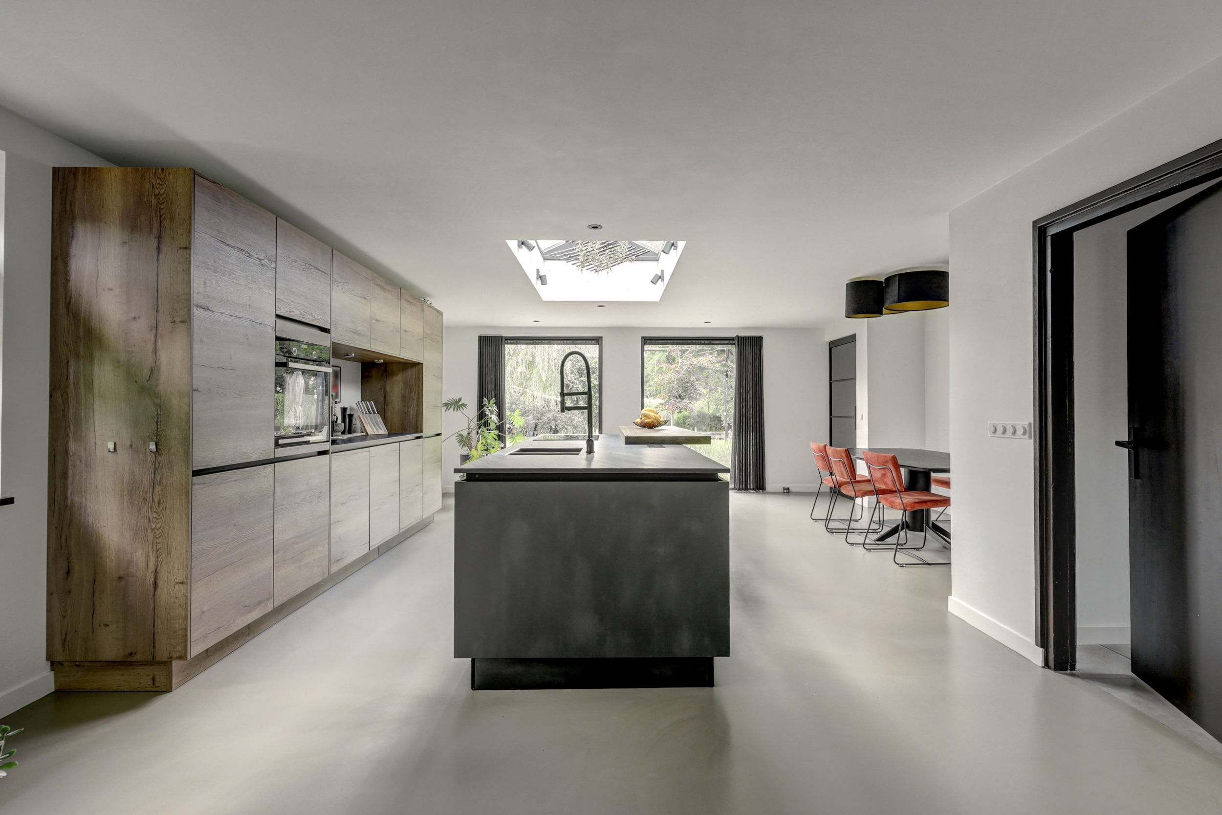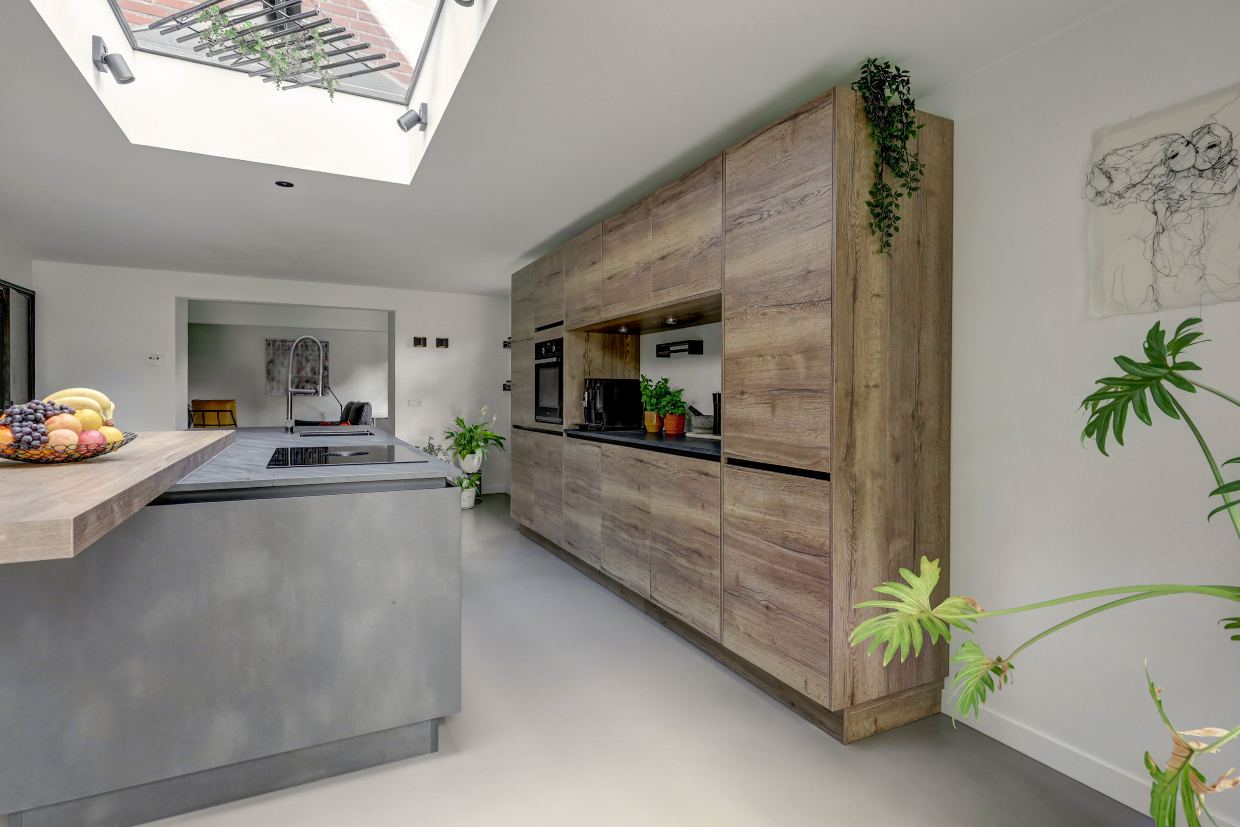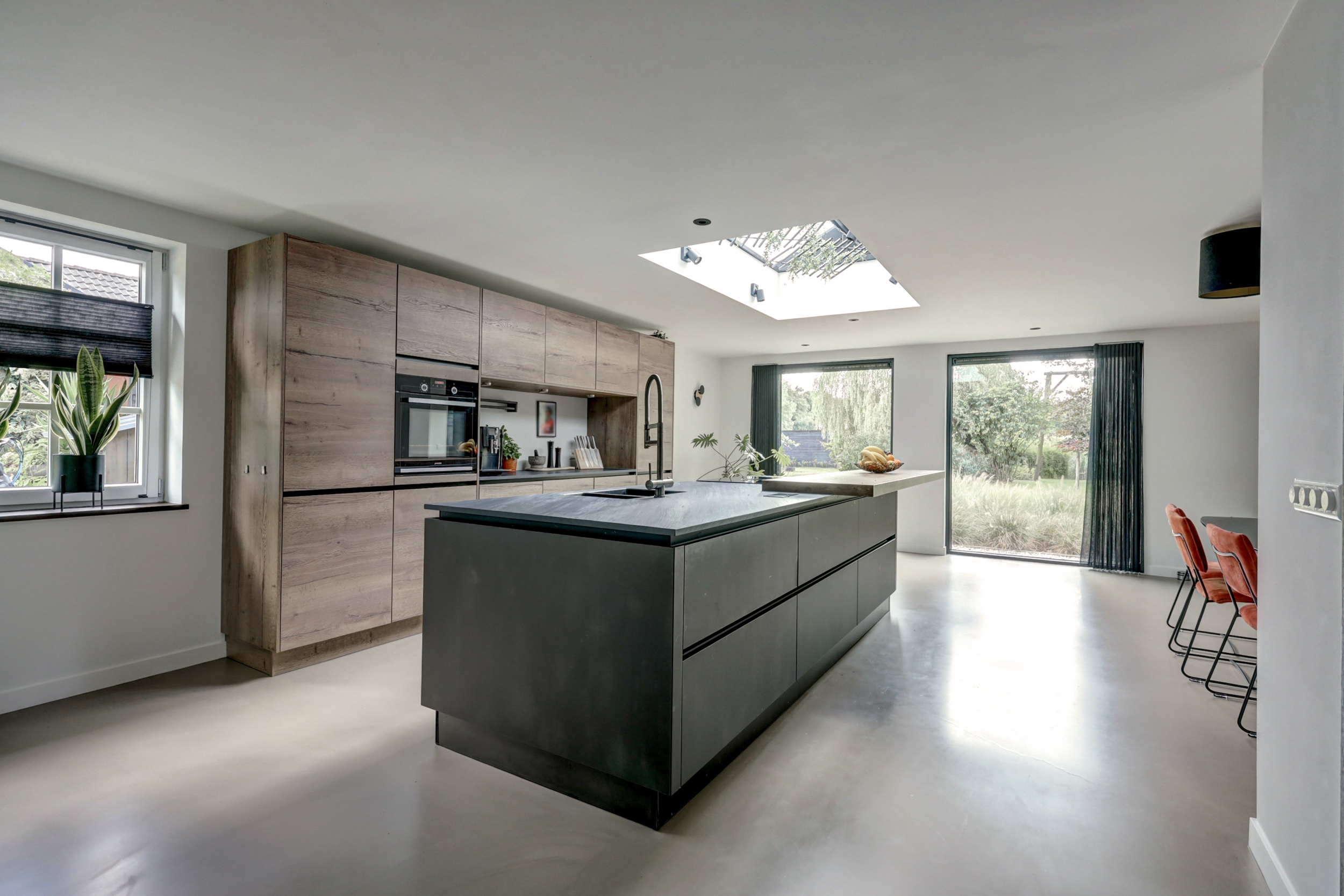 De moderne keukeninrichting met kook-/ spoeleiland beschikt over een inductiekookplaat met geïntegreerde afzuiging, oven, vaatwasser, koelkast, vriezer, spoelbak met Quooker en een barretje.