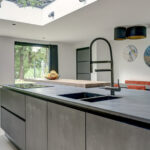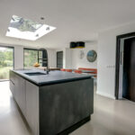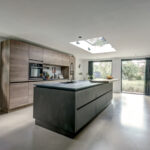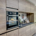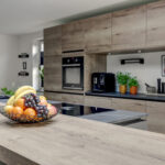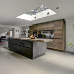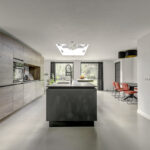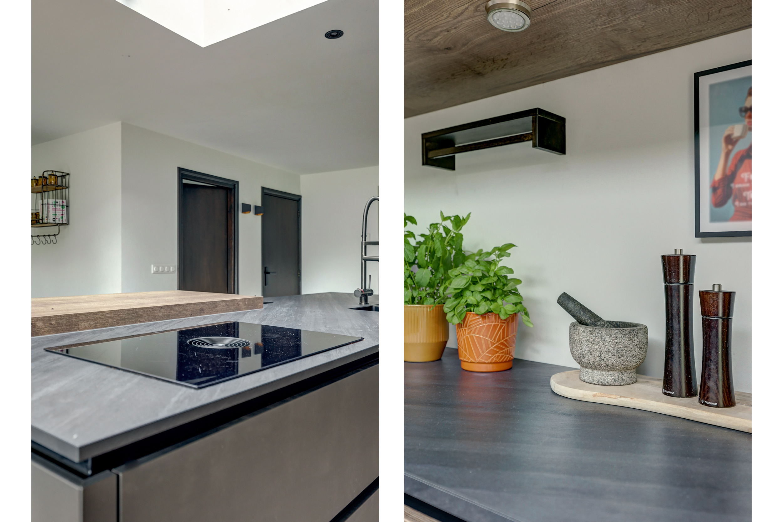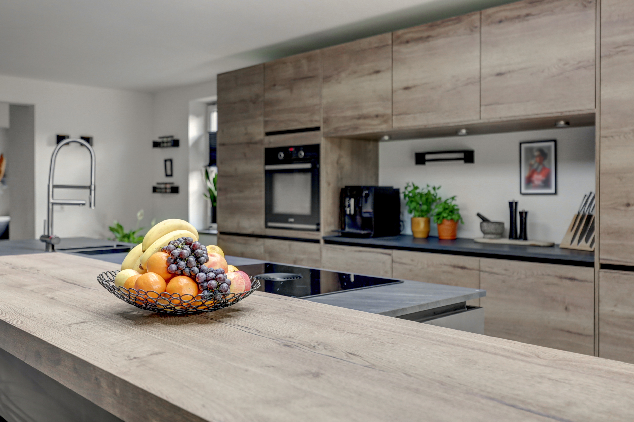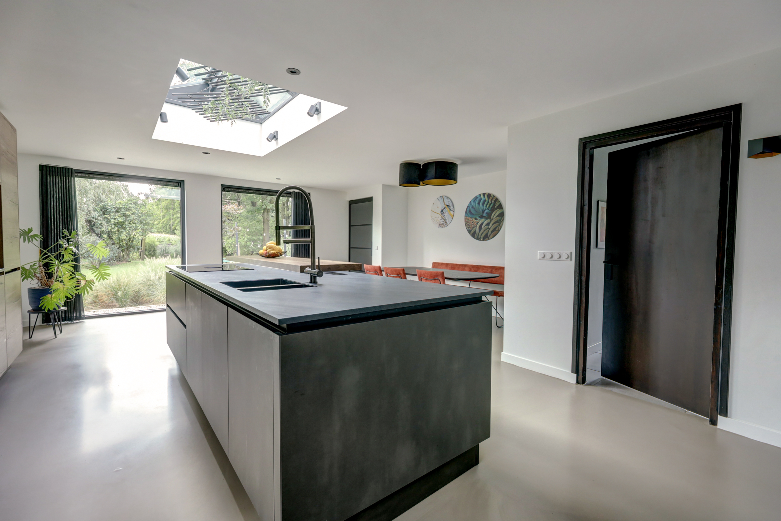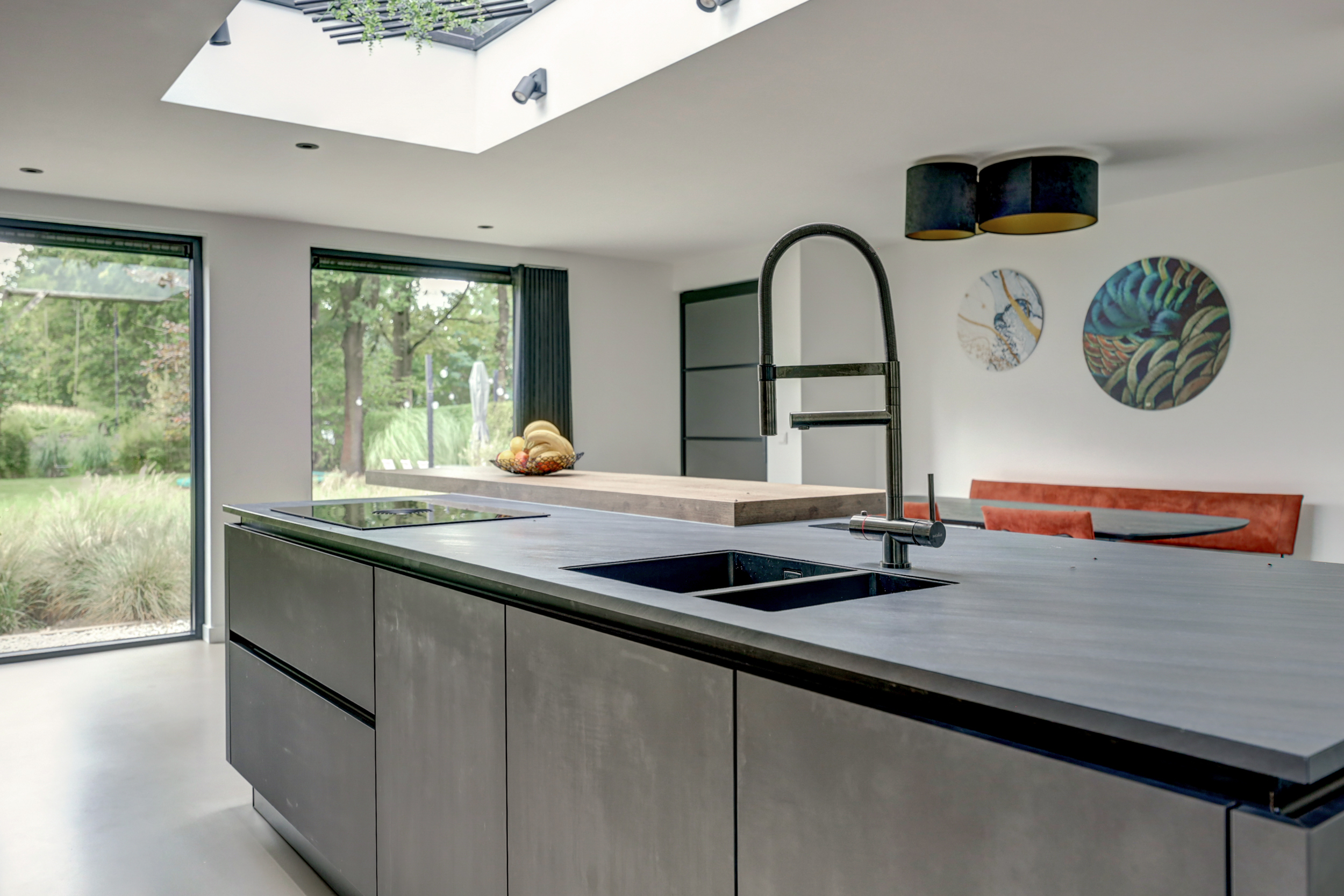 De moderne keukeninrichting met kook-/ spoeleiland beschikt over een inductiekookplaat met geïntegreerde afzuiging, oven, vaatwasser, koelkast, vriezer, spoelbak met Quooker en een barretje.
