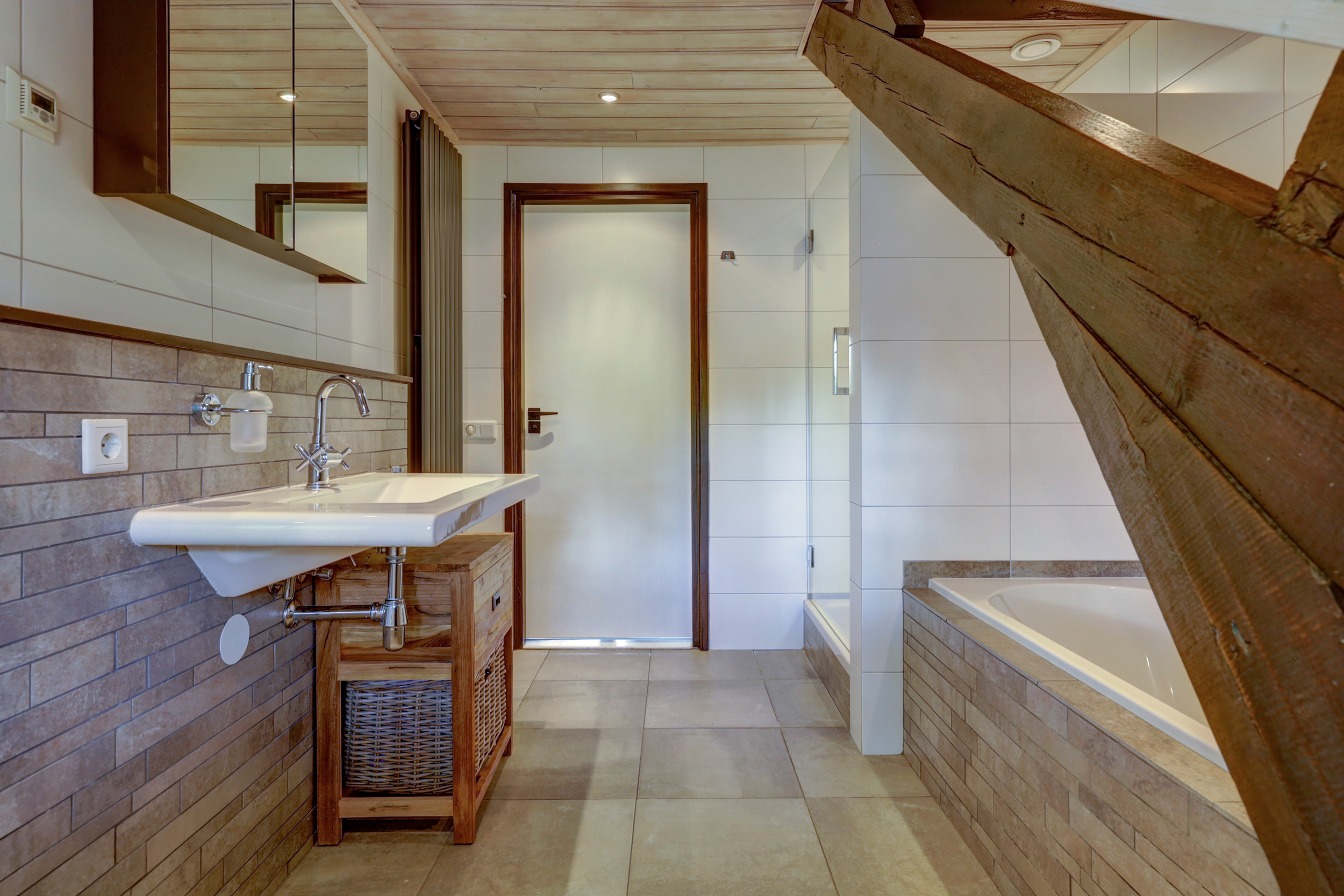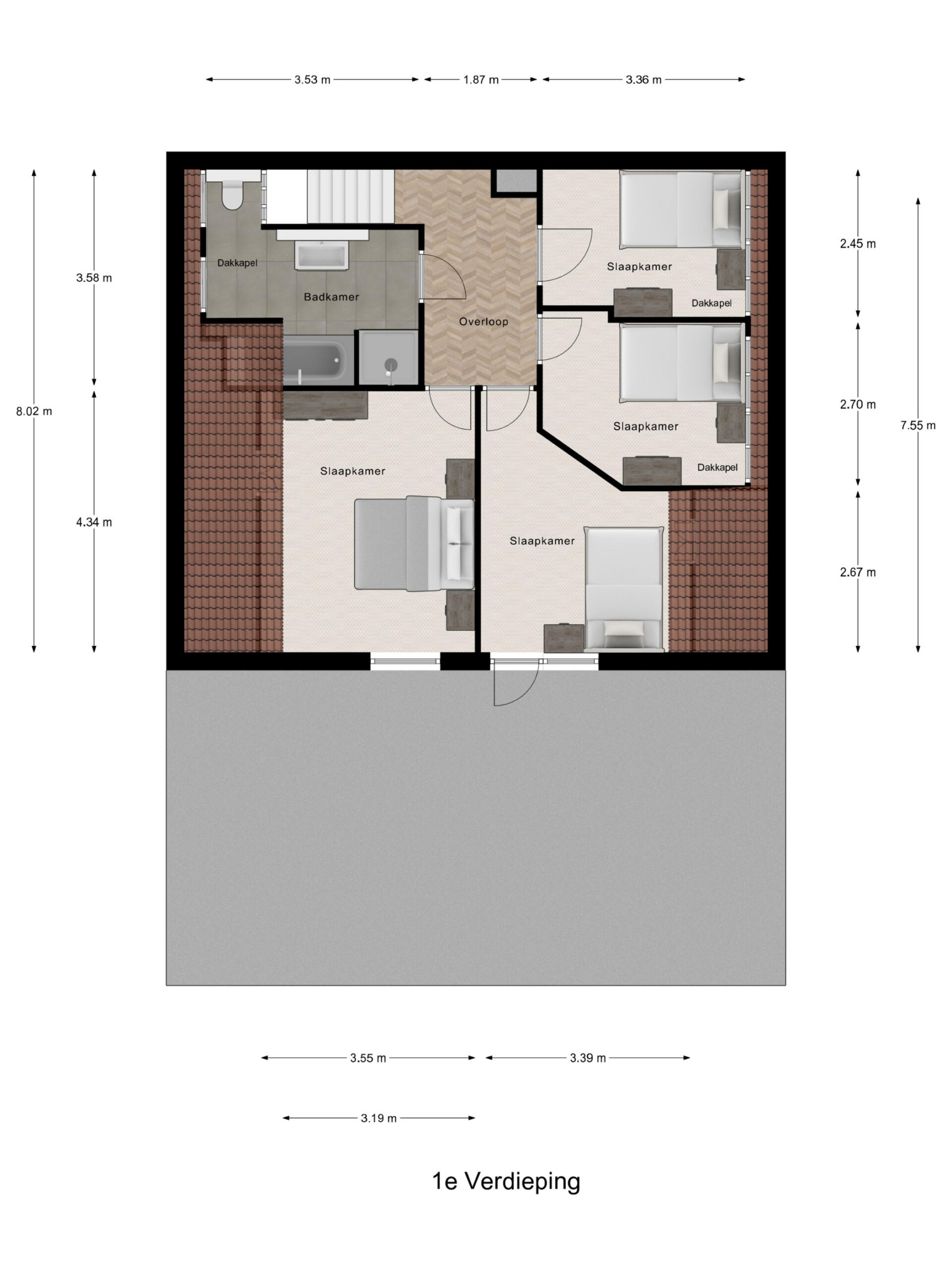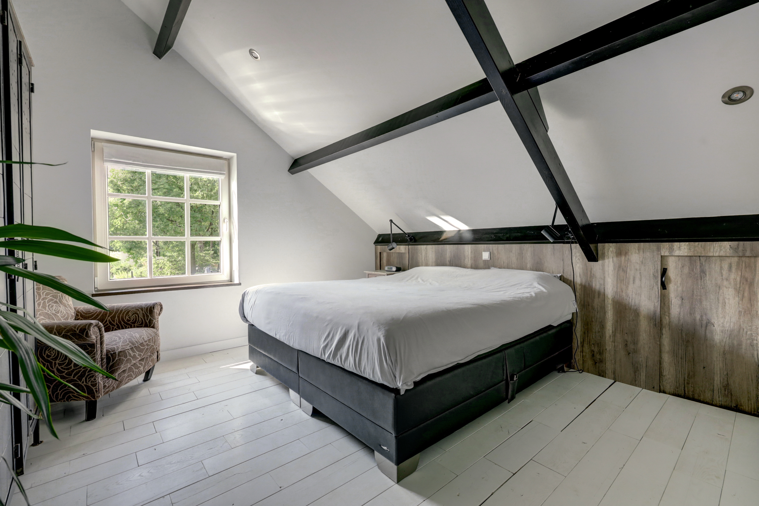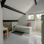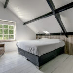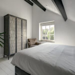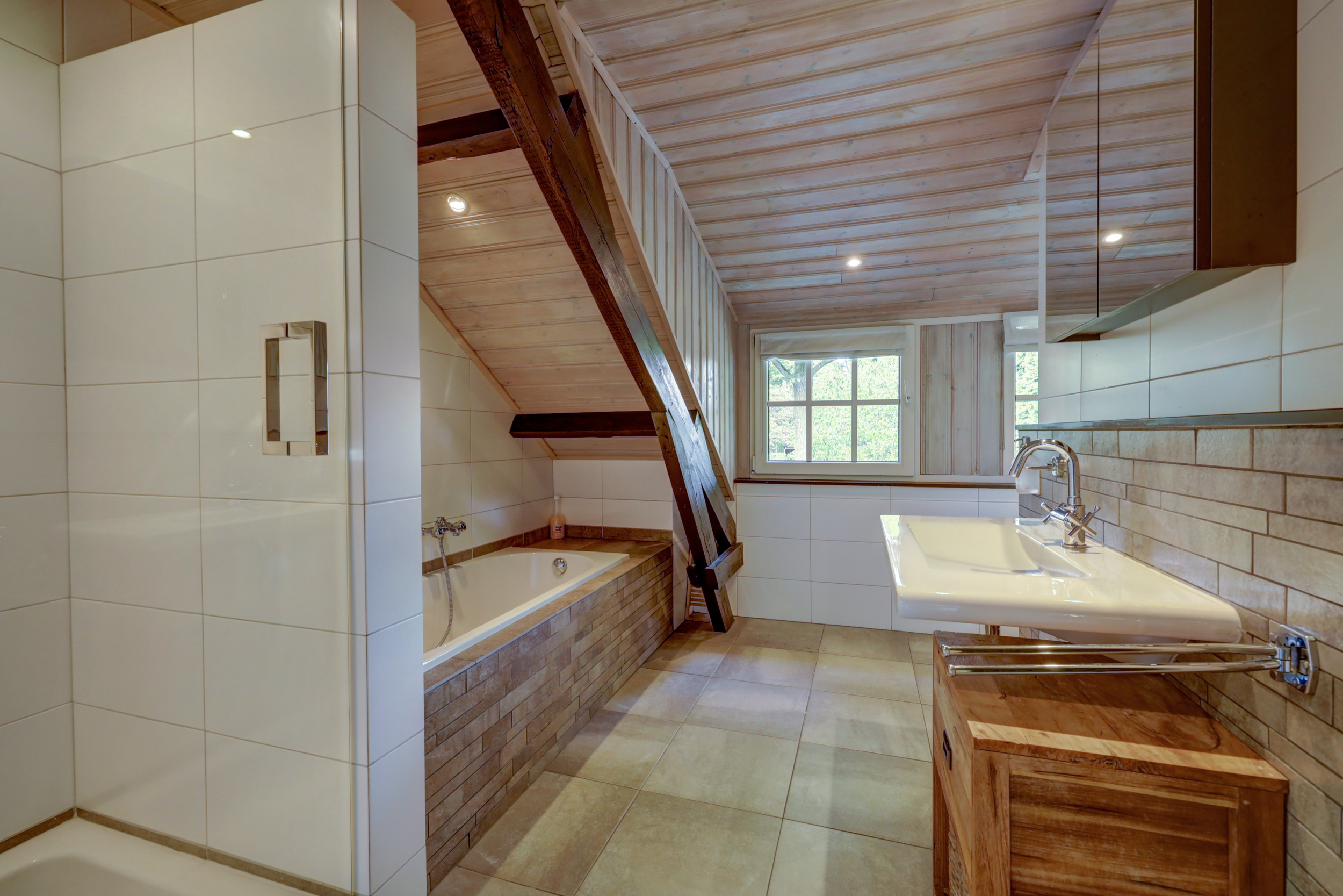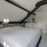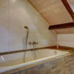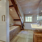 1e verdieping: overloop, 4 slaapkamers waarvan er 2 zijn voorzien van een grote dakkapel. Fraaie badkamer met dakkapel voorzien van een ligbad, douche, wastafel en wandcloset. Over de gehele verdieping is de fraaie dakconstructie met houten balken zichtbaar.