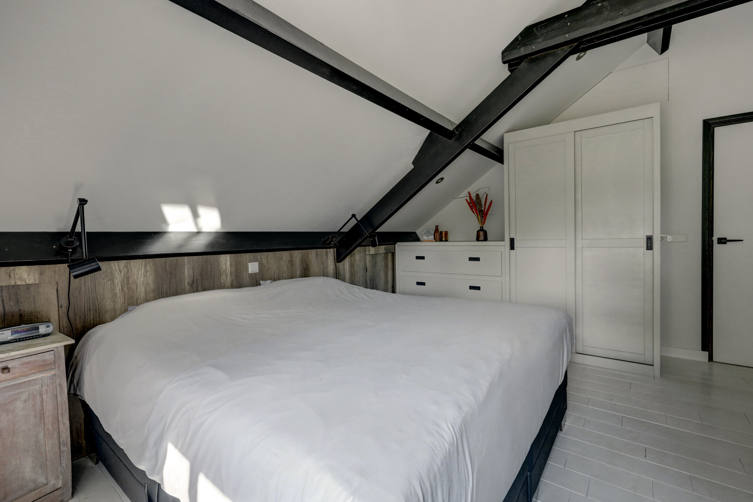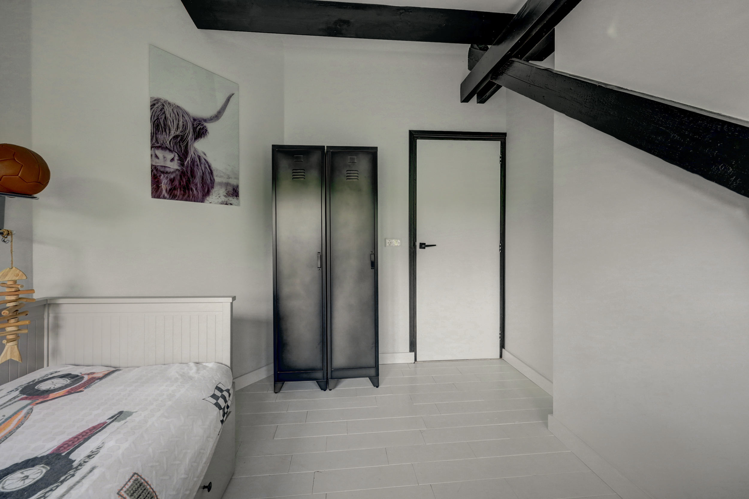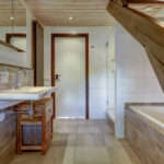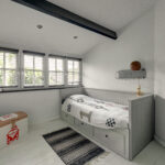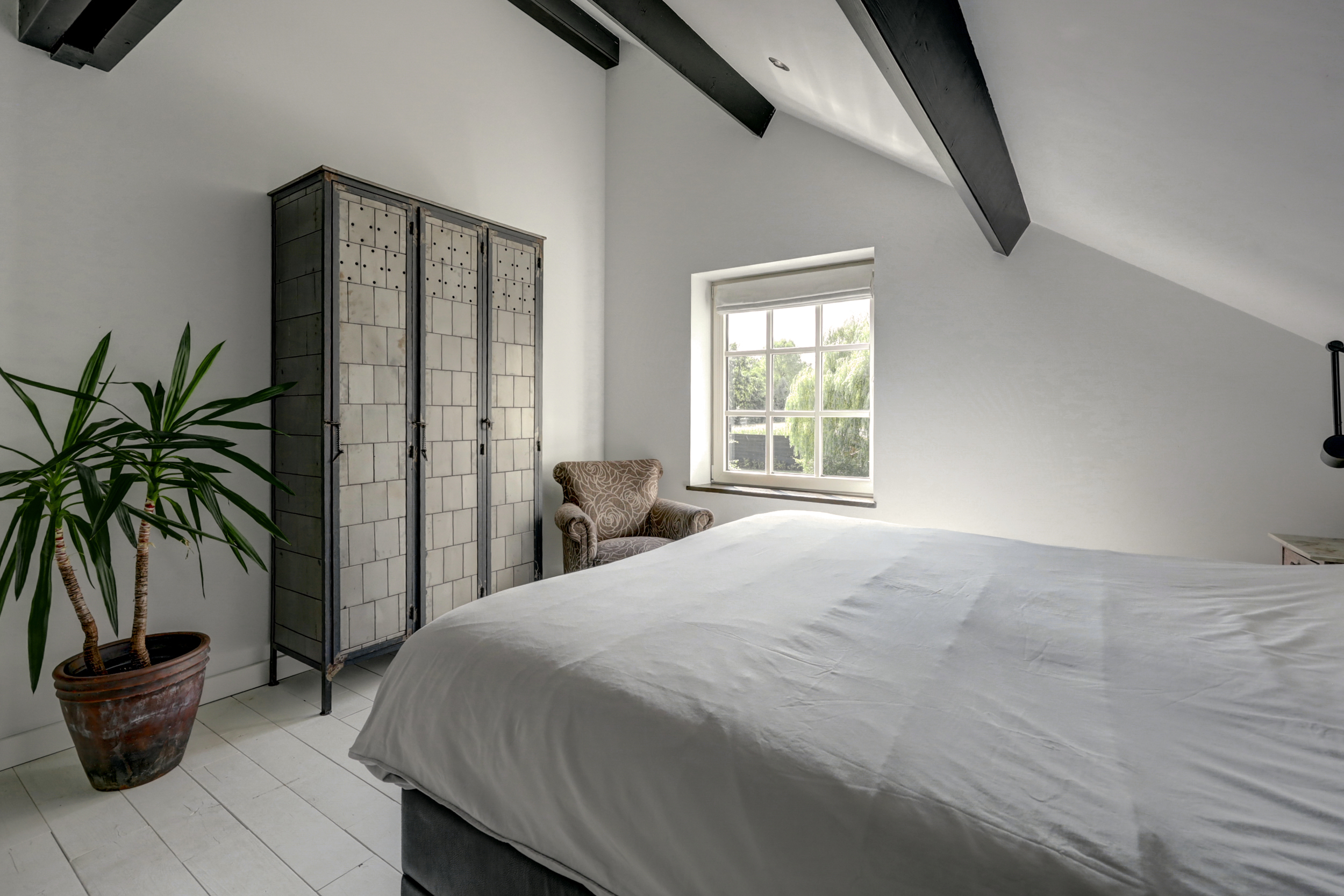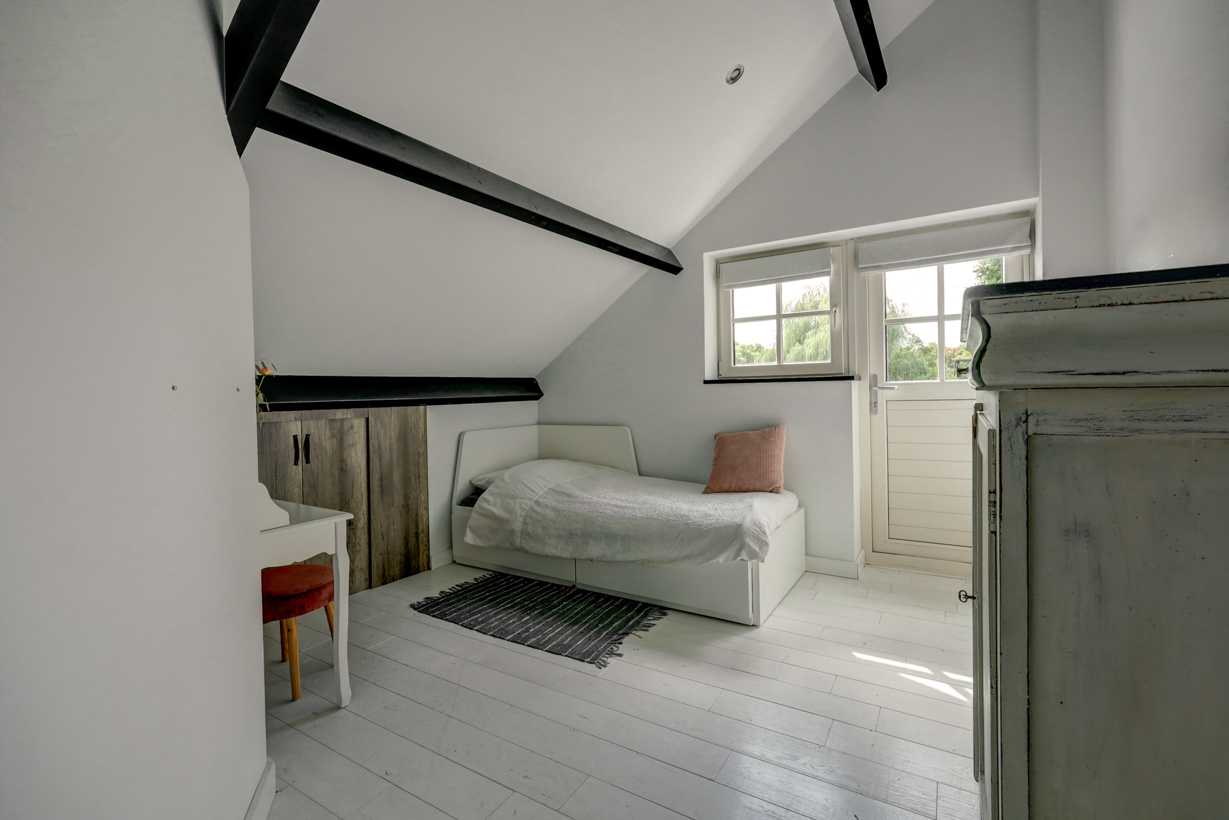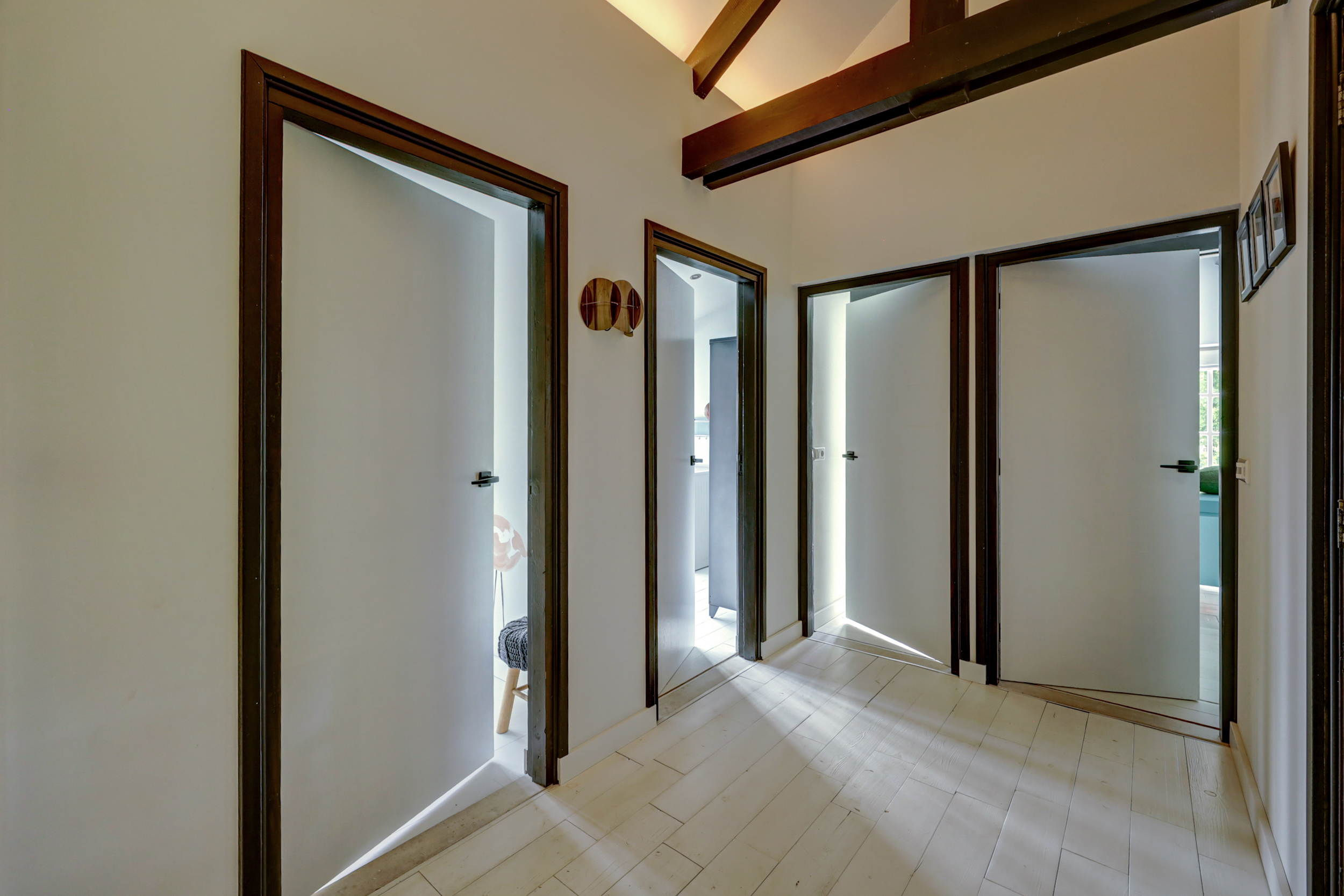 1e verdieping: overloop, 4 slaapkamers waarvan er 2 zijn voorzien van een grote dakkapel. Fraaie badkamer met dakkapel voorzien van een ligbad, douche, wastafel en wandcloset. Over de gehele verdieping is de fraaie dakconstructie met houten balken zichtbaar.