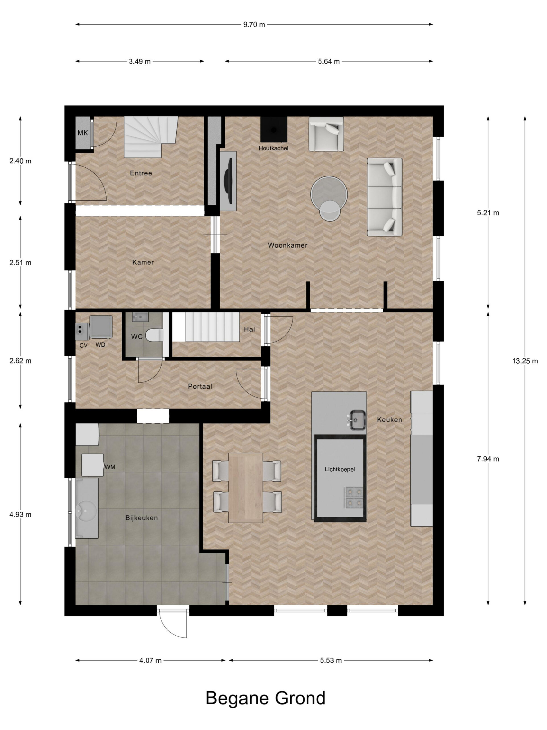 Begane grond: ruime entree/ hal met trapopgang met ruimte voor een werkplek, sfeervolle woonkamer met een houtkachel en vloerverwarming, moderne open keuken met kook-/ spoeleiland voorzien van de benodigde inbouwapparatuur. Vanuit de keuken heb je toegang tot de provisiekelder en het portaal met de cv-ketel, droger en toiletruimte voorzien van wandcloset en fonteintje. Vanuit het portaal en de keuken is de praktische bijkeuken bereikbaar met de witgoedaansluitingen en een keukenblok met spoelbak.