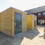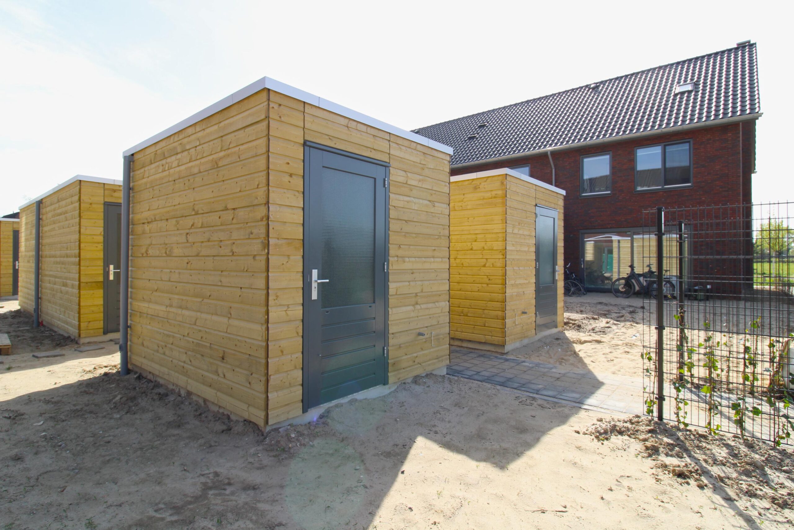 De vrijstaande houten berging is voorzien van elektra.
