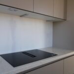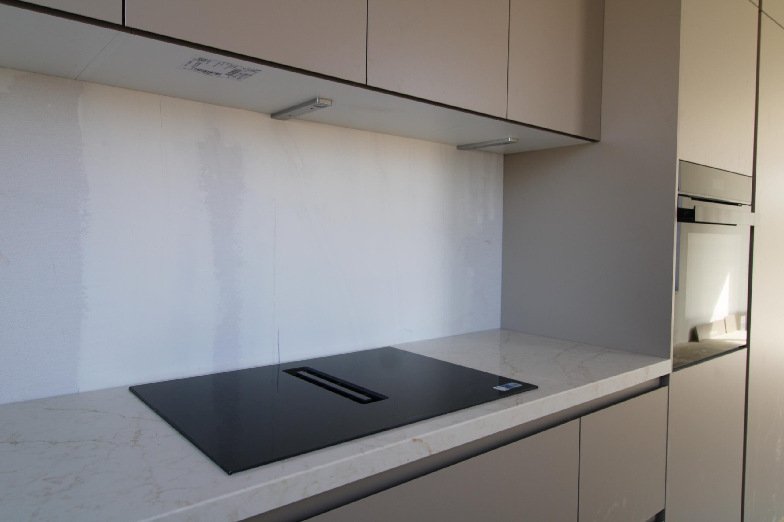 De keukeninrichting bestaat uit inductiekookplaat met geïntegreerde afzuiging, vaatwasser, combioven, koelkast en spoelbak.