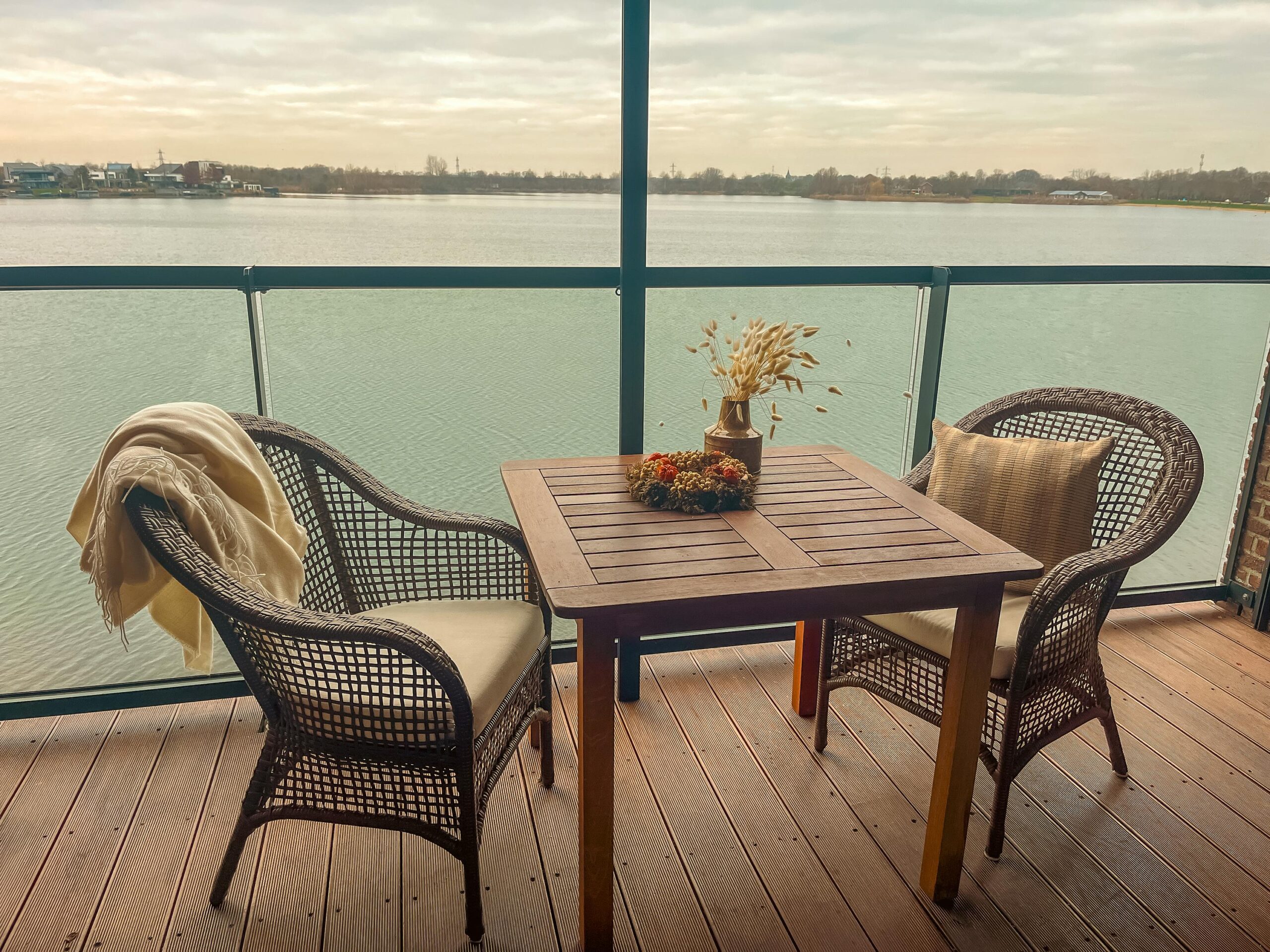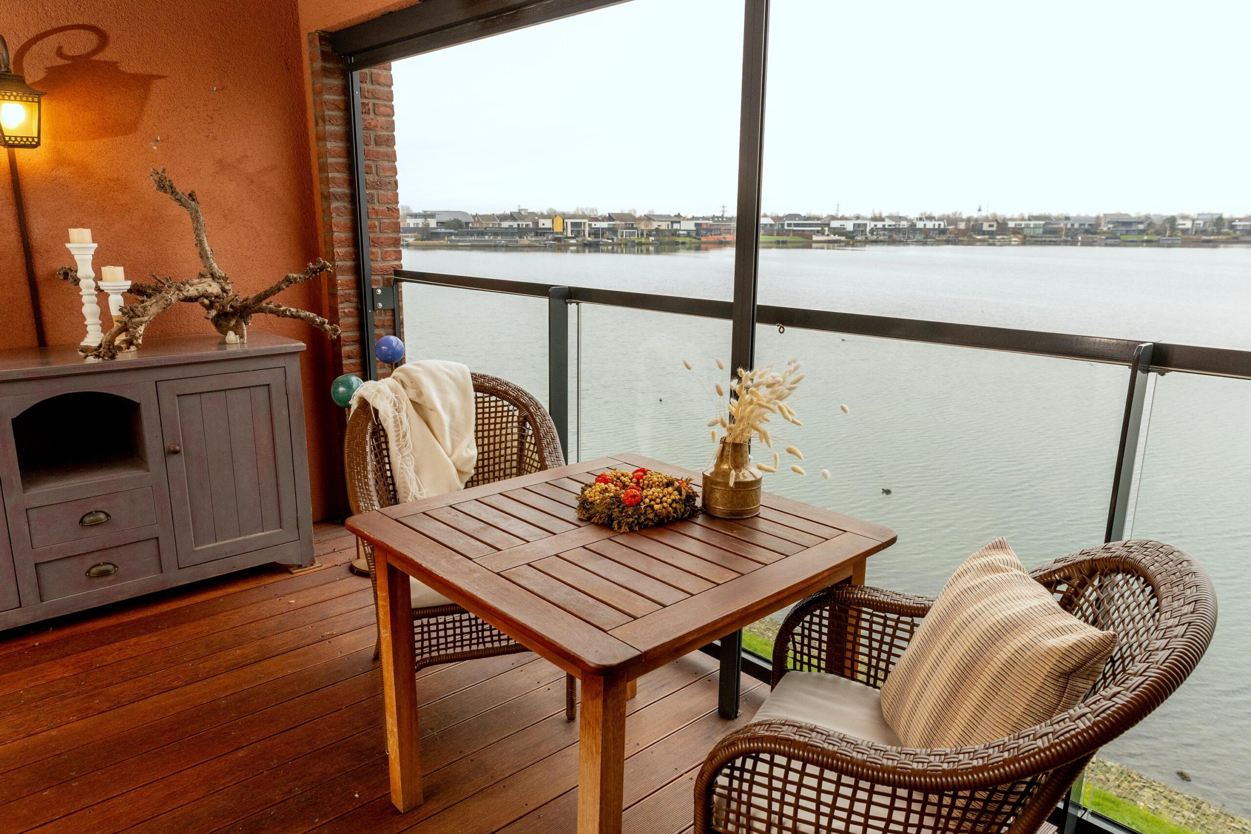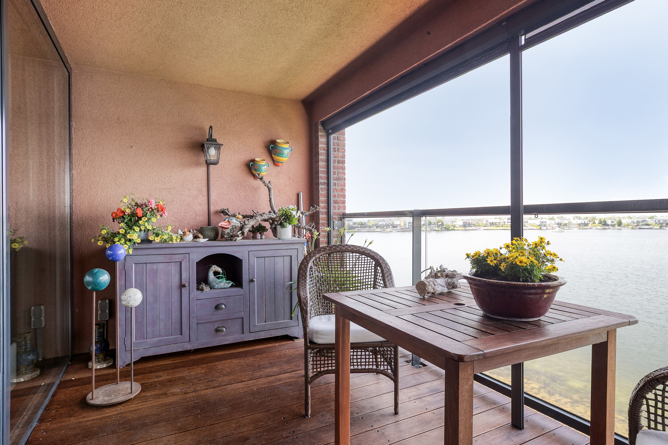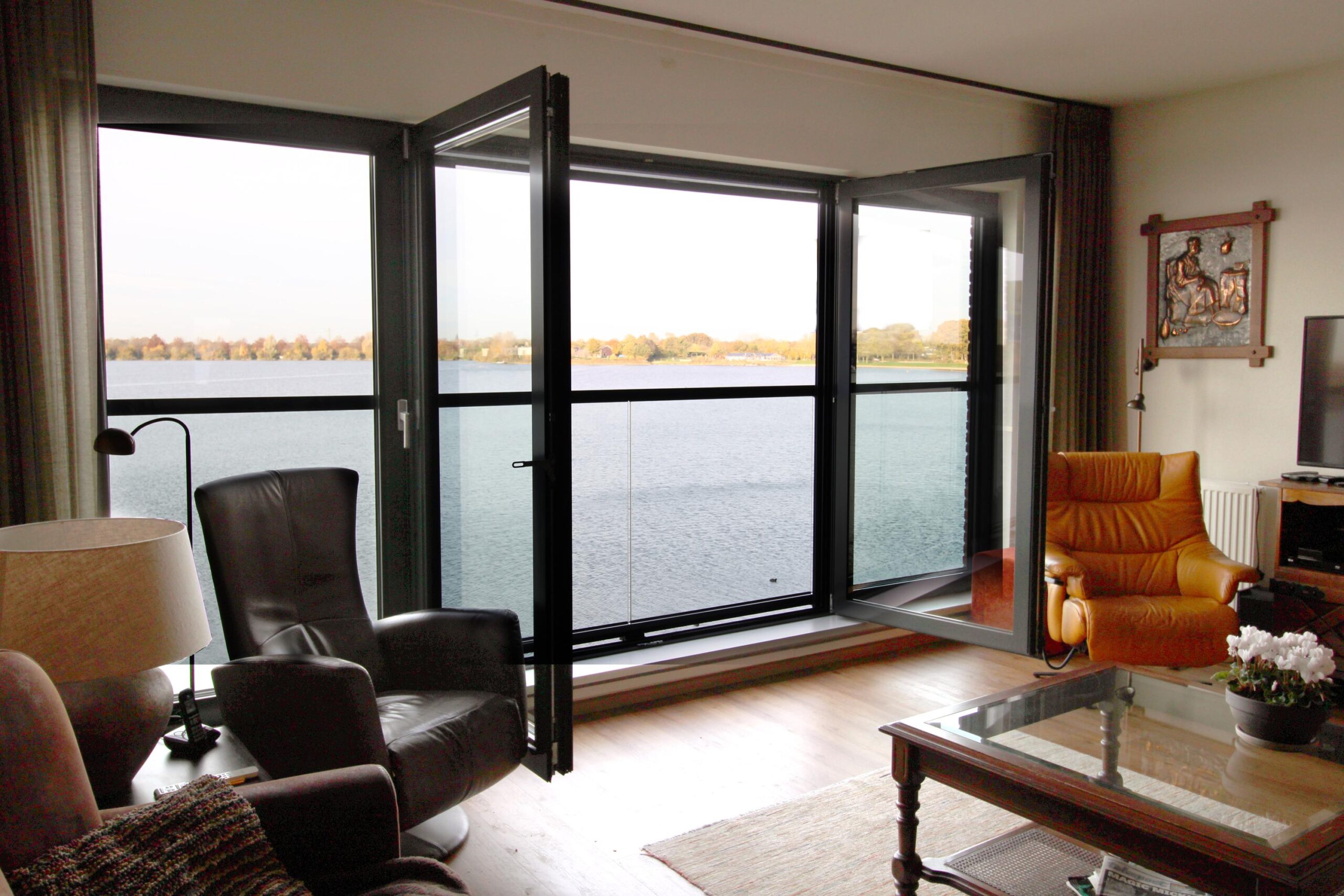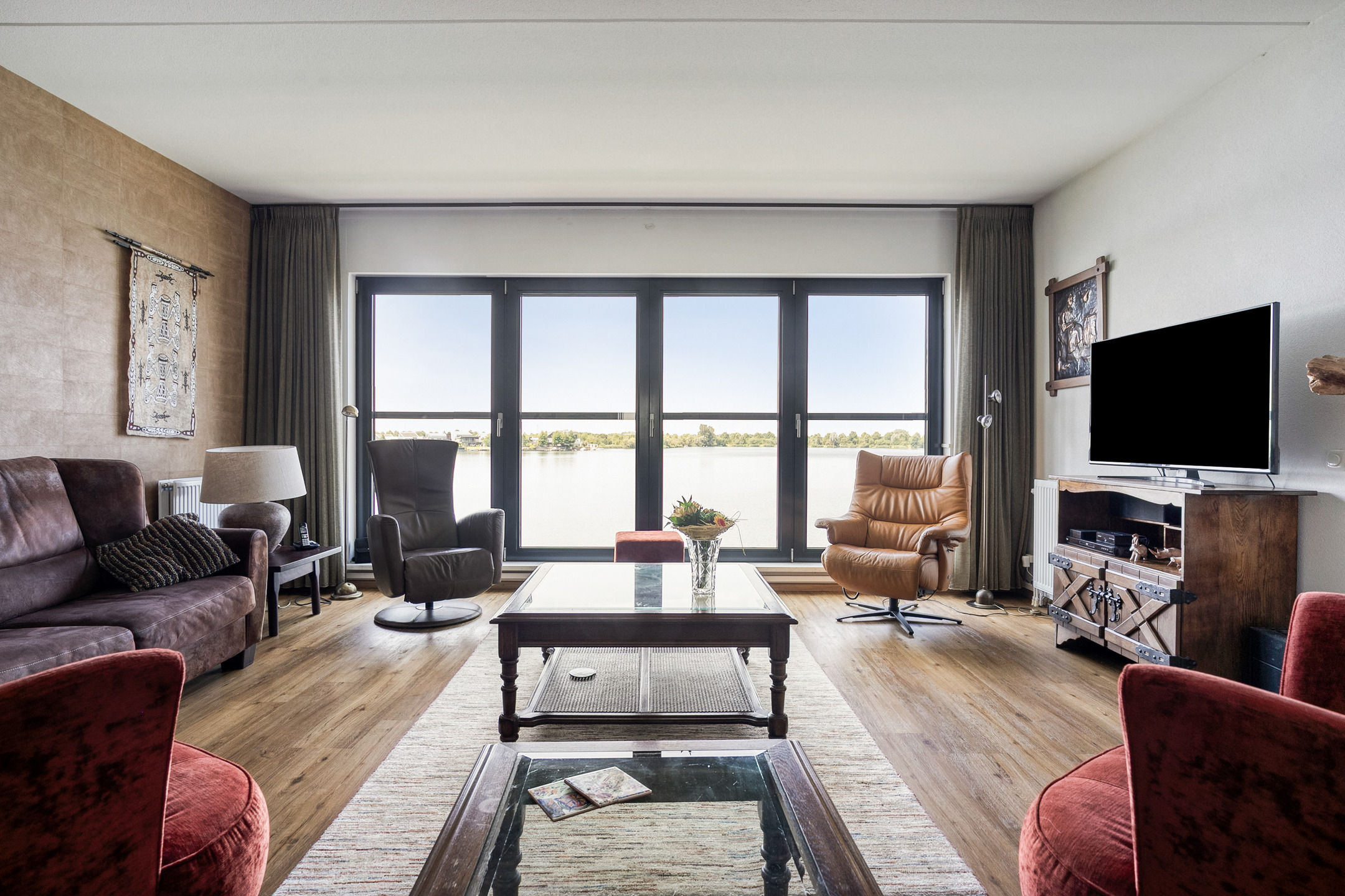 1e verdieping: entree, hal, berging met de opstelling voor een wasmachine en de cv-ketel, toilet met fonteintje, een geheel betegelde badkamer voorzien van een douche, toilet en wastafel, 3 slaapkamers met veel lichtinval en waarvan één toegang heeft tot de badkamer, een zeer royale living met aan de voorzijde enorme raampartijen tot aan de grond, waardoor er een zeer fraai uitzicht is over het water, een ruime woonkeuken in hoekopstelling, welke voorzien is van inbouwapparatuur, het zonnige balkon is middels een schuifpui bereikbaar, hier zit je aan 3 zijden beschut en er zijn screens aanwezig.