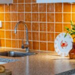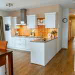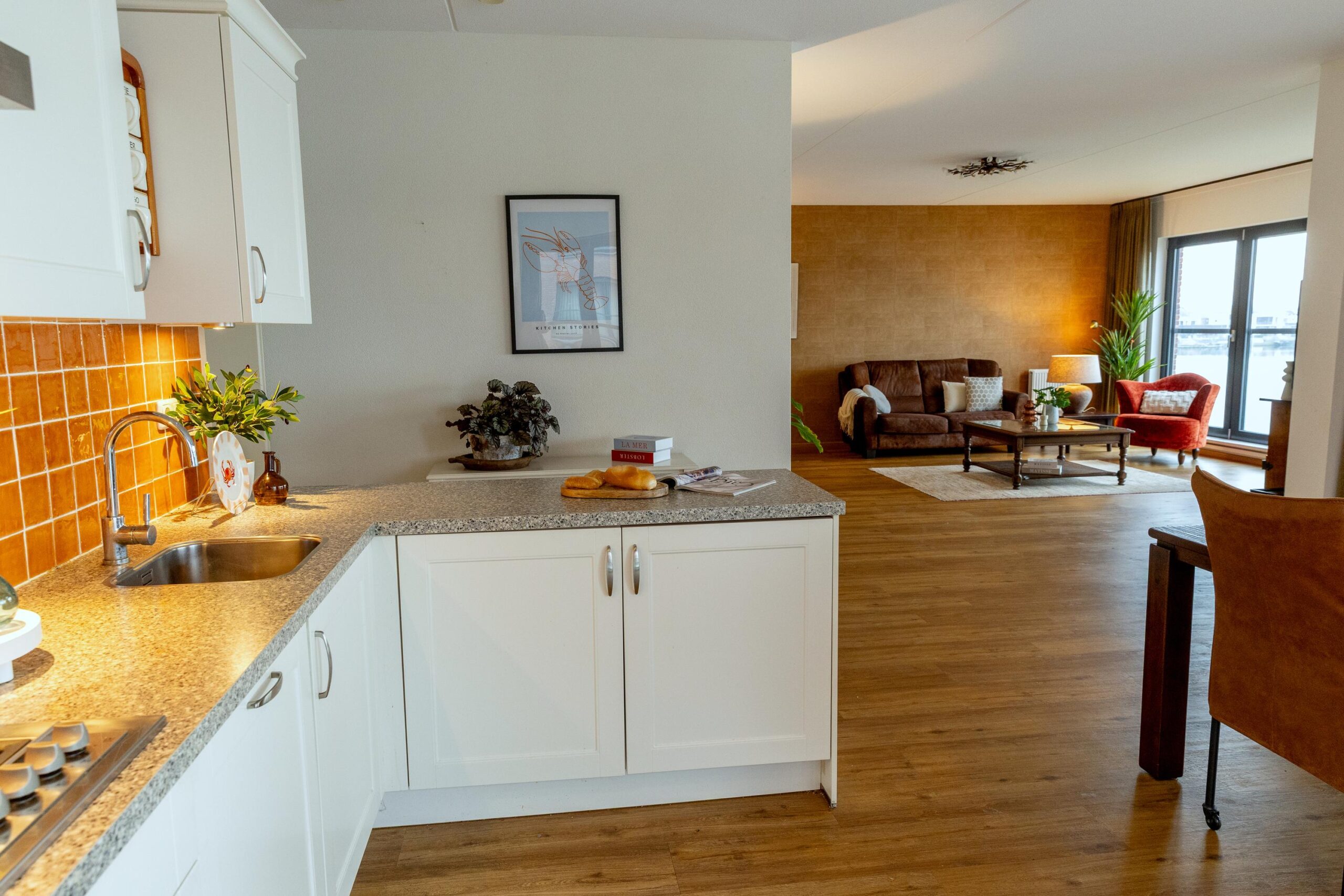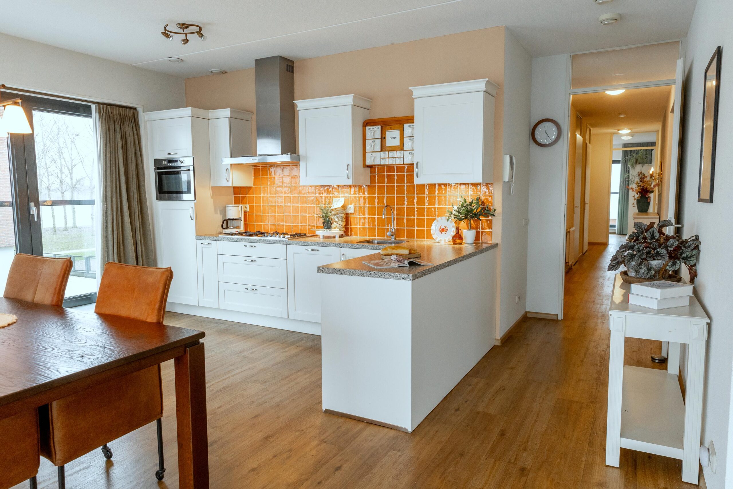 De keukenopstelling is voorzien van een spoelbak, vaatwasser, koelkast, 5-pits gaskookplaat, afzuigkap, vriezer en afzuigkap.
