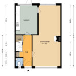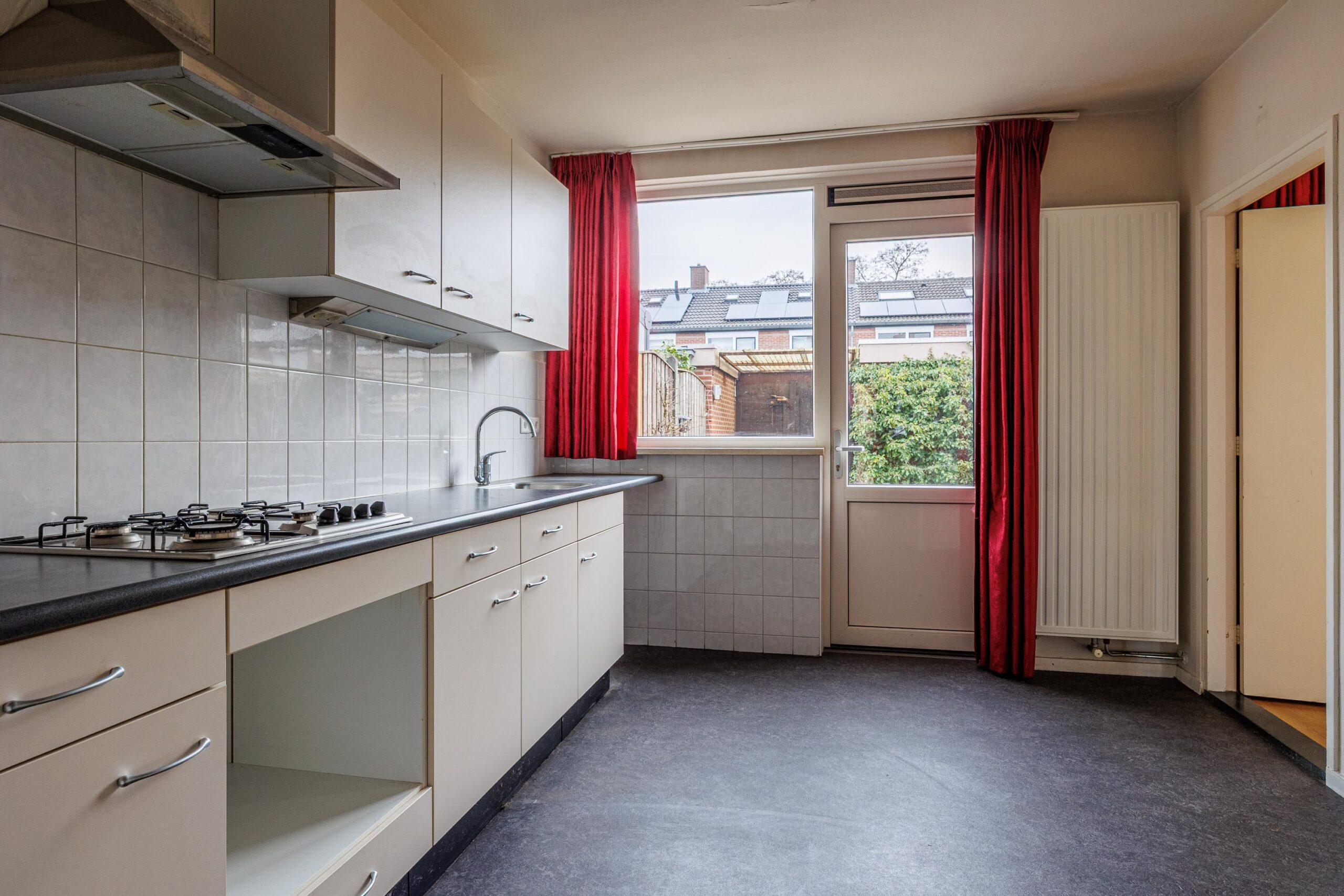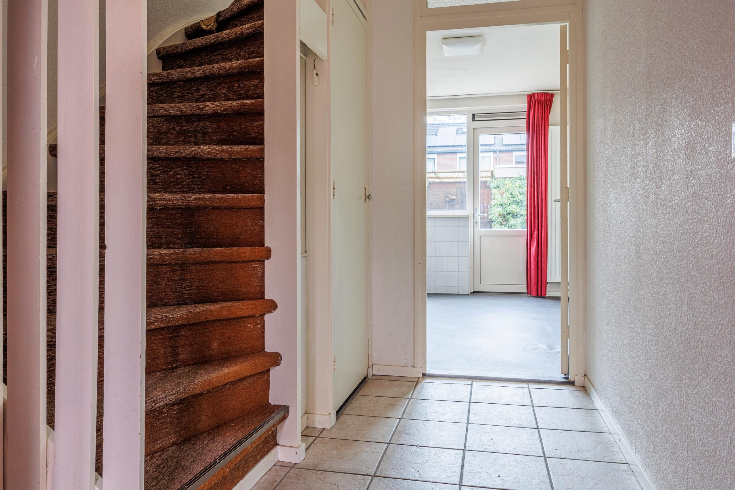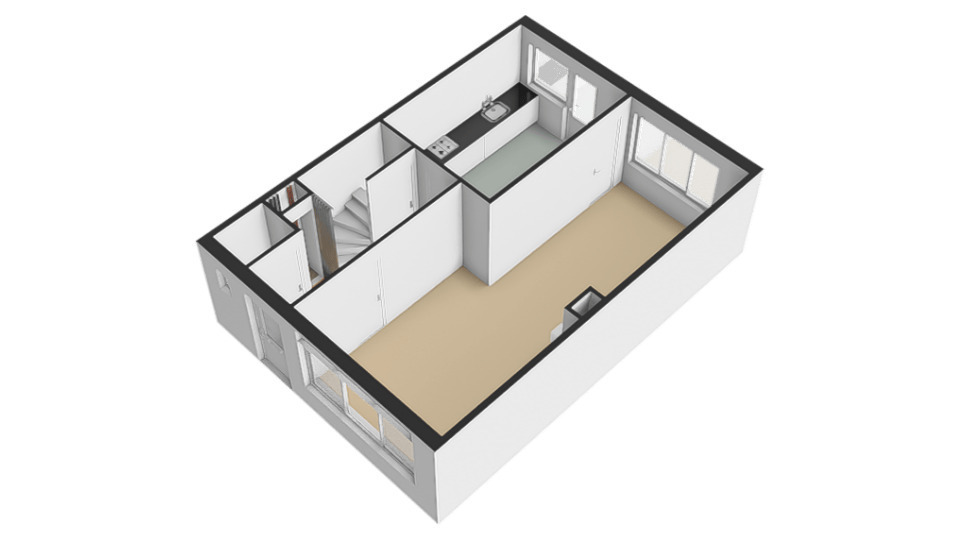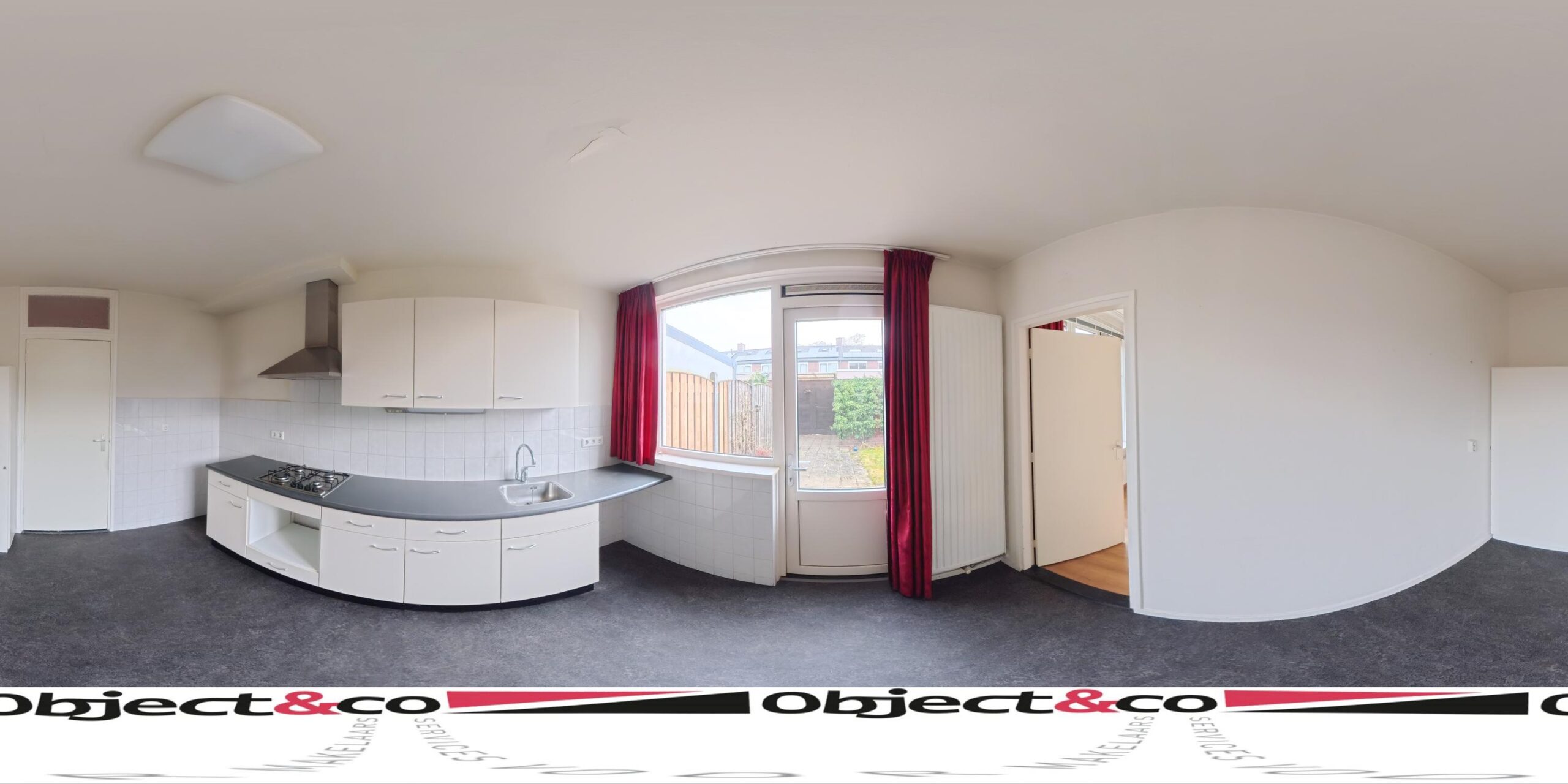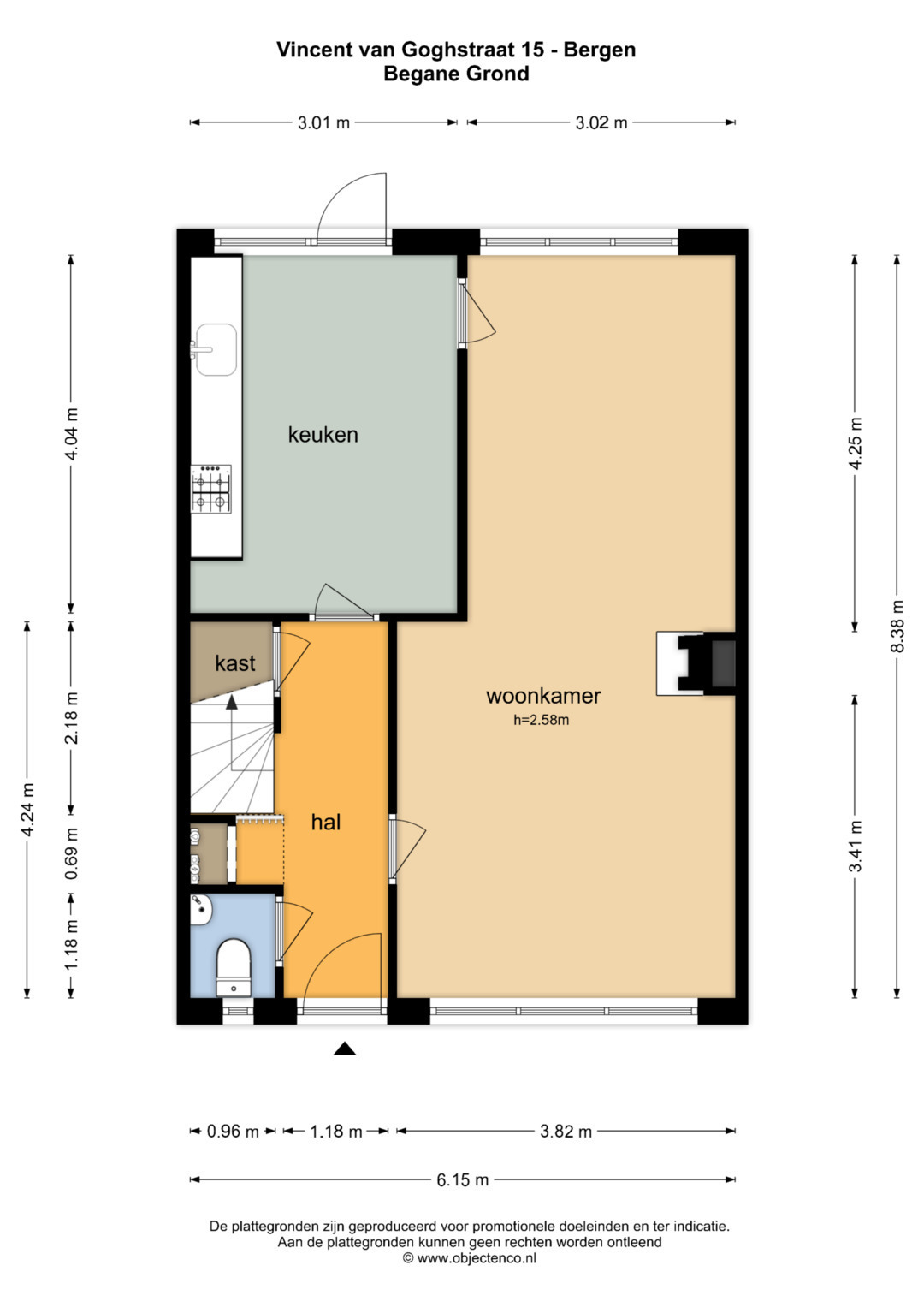 Begane grond: hal, toilet, trapkast, dichte keuken met een functionele keukenopstelling, doorzonwoonkamer.