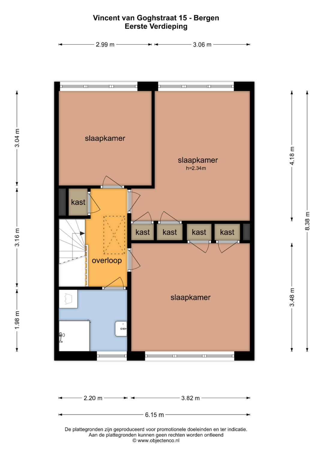 1e verdieping: overloop, bergkast, 3 ruime slaapkamers, een in lichte kleuren afgewerkte geheel betegelde badkamer voorzien van een inloopdouche, vaste wastafel en een witgoedaansluiting.