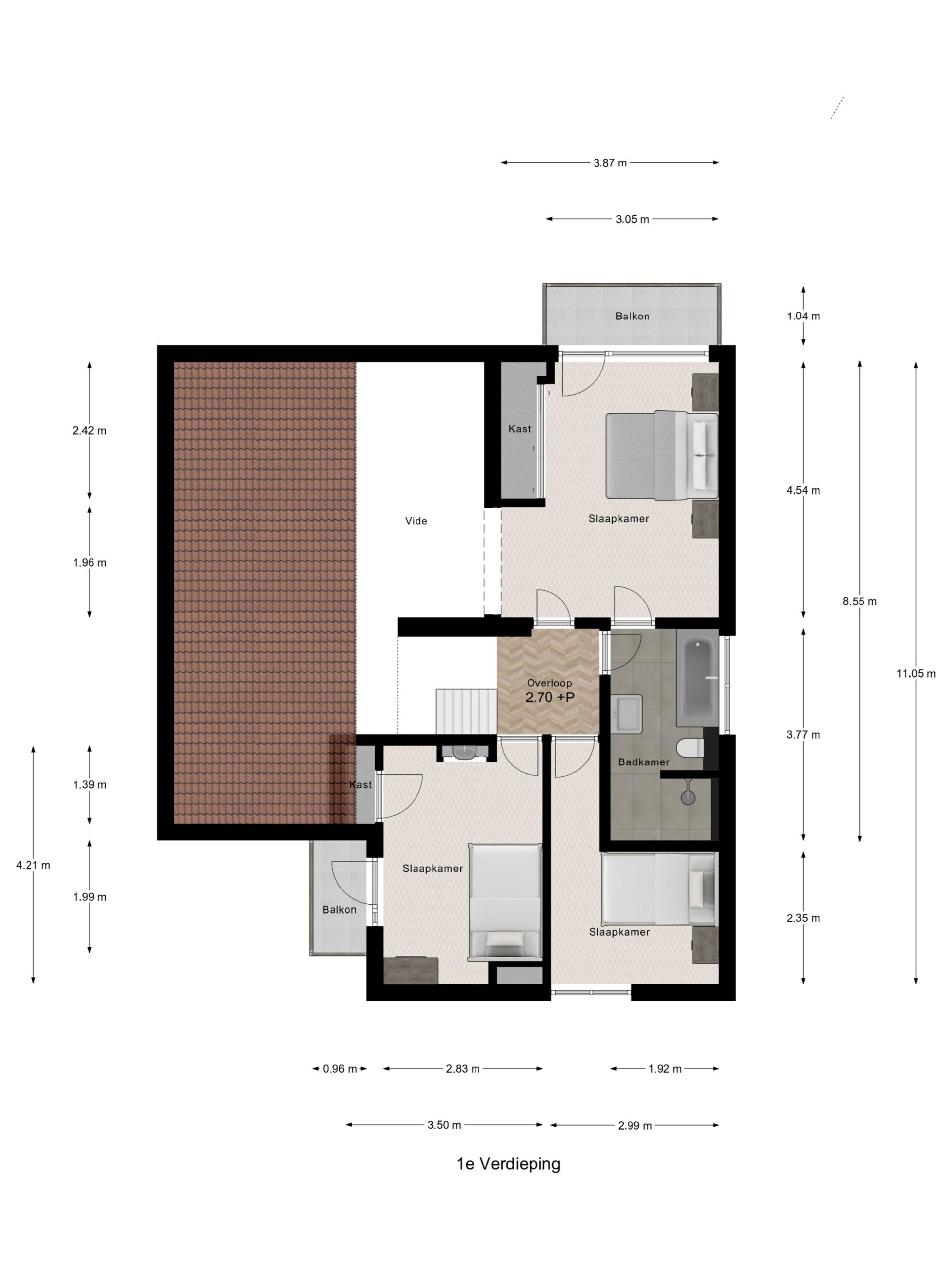 De slaapkamers aan de voorzijde zijn met een entresol voor extra bergruimte. Het balkon en een wasbak is extra op één slaapkamer.