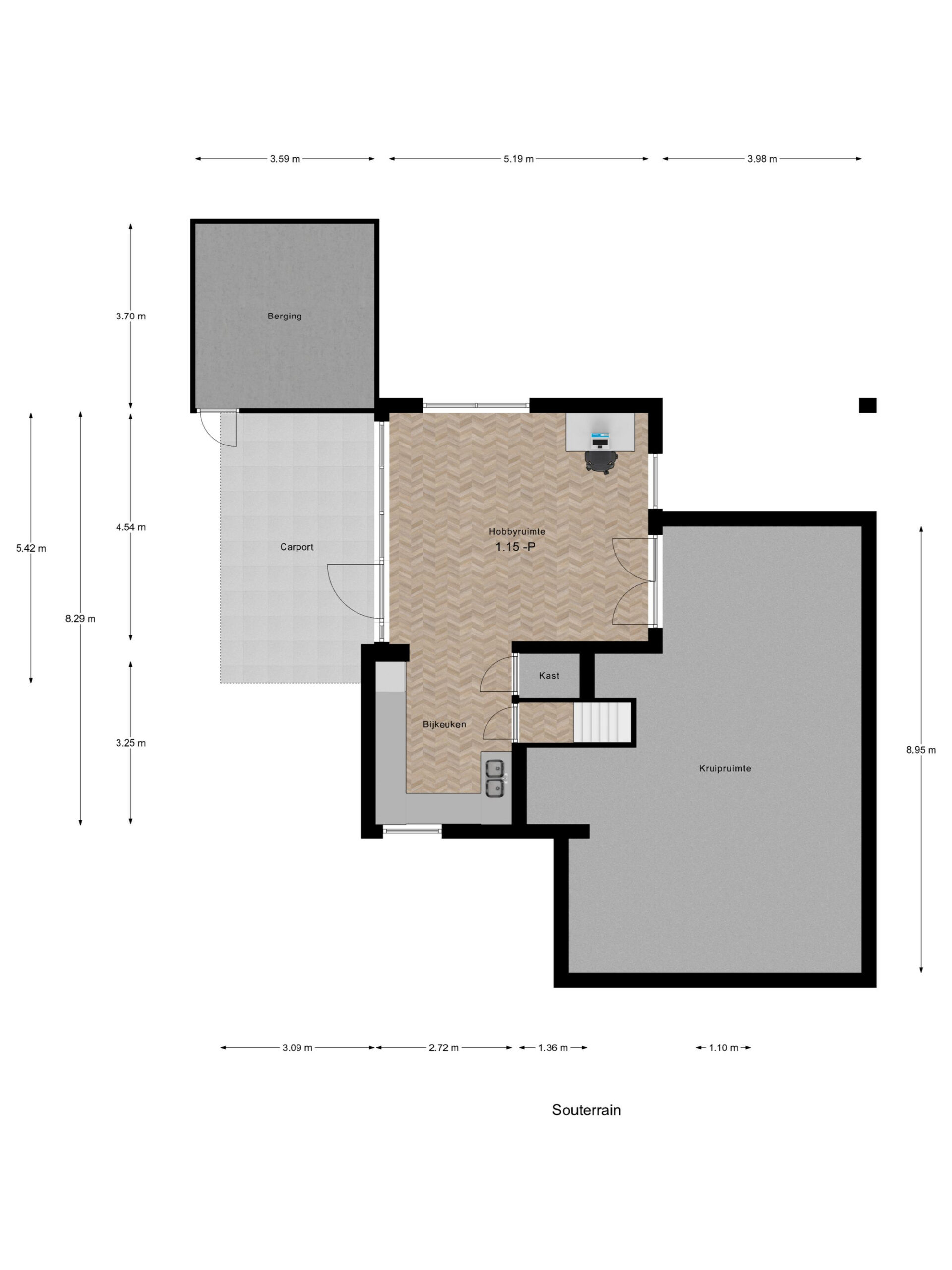 Vanaf de eetkamer is er de extra woonlaag naar het souterrain. De toegang naar de grote garage/ berging. De ideale plek om meerdere fietsen te stallen en uw gereedschap veilig op te bergen. Een compleet keukenblok en werkbank staan hier klaar om alle denkbare hobby’s uit te oefenen. Brede deuren naar de betegelde kruipruimte bieden veel extra bergruimte. De pomp is er voor de ondergronds aangelegde regeninstallatie van de voor- en achtertuin. De brede deur geeft toegang naar carport en inrit. Aan de carport is de buitenberging voor aanhanger en tuingereedschap. In de achtertuin is de plantenkas die tevens bruikbaar is voor de opslag van tuinmeubilair.