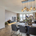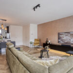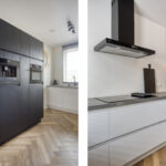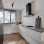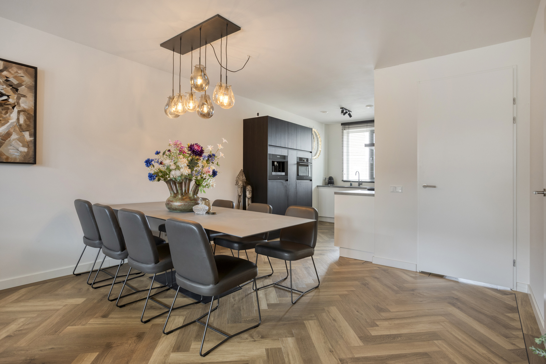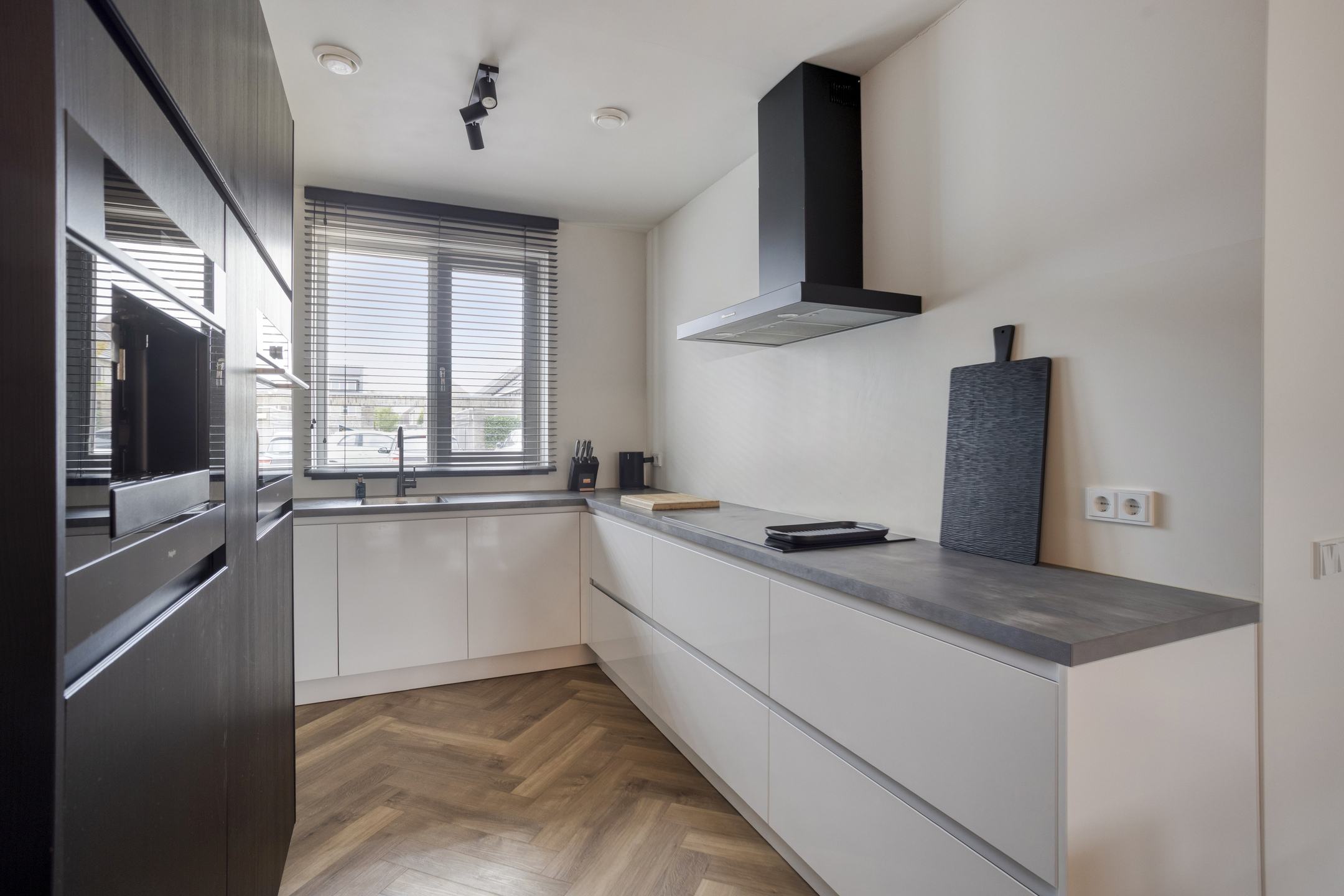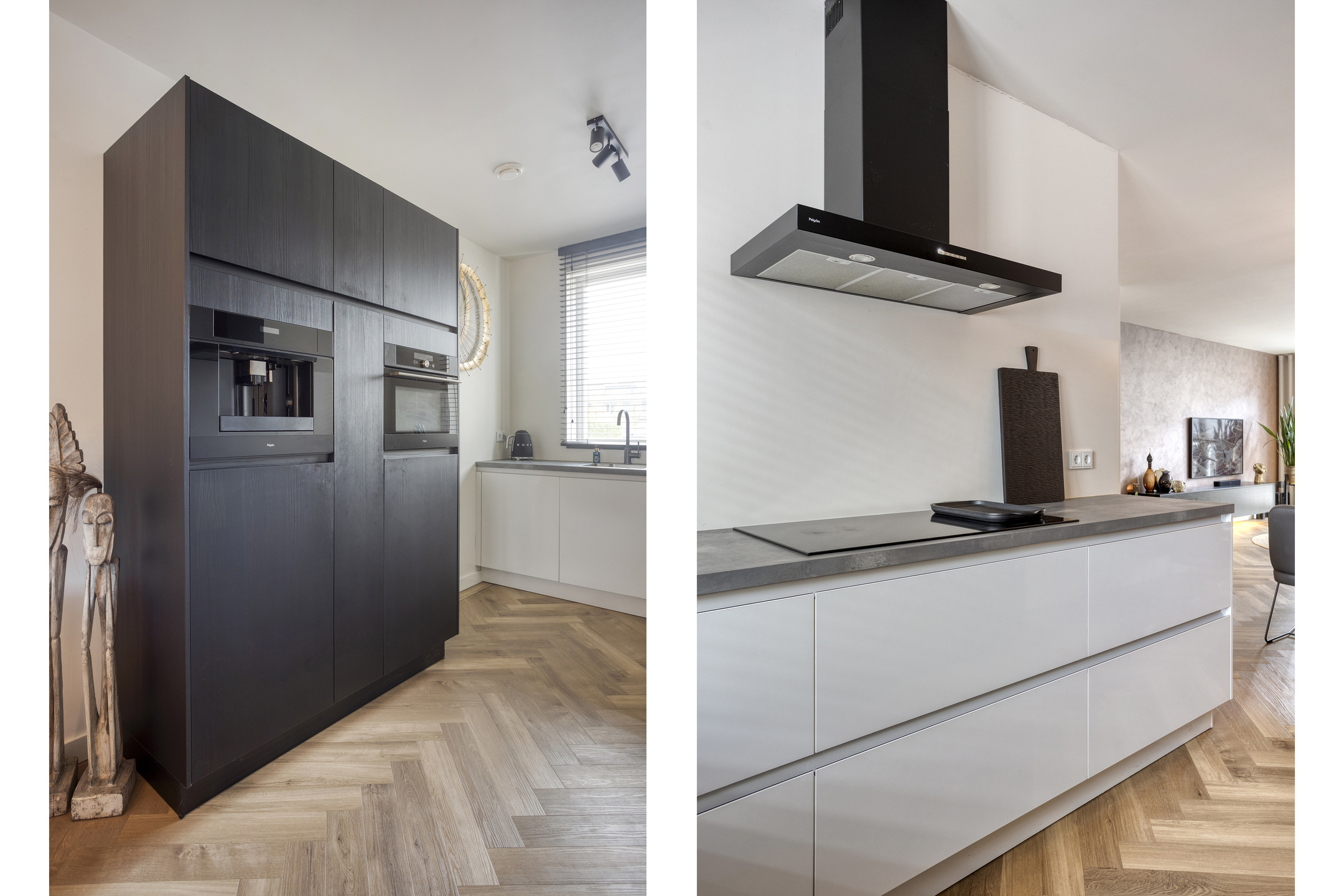 Een luxe keukeninrichting die is voorzien van een spoelbak, vaatwasser, inductiekookplaat, afzuigkap, koel-/ vriescombinatie, koffiezetapparaat en combioven.