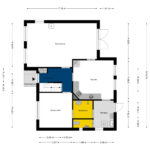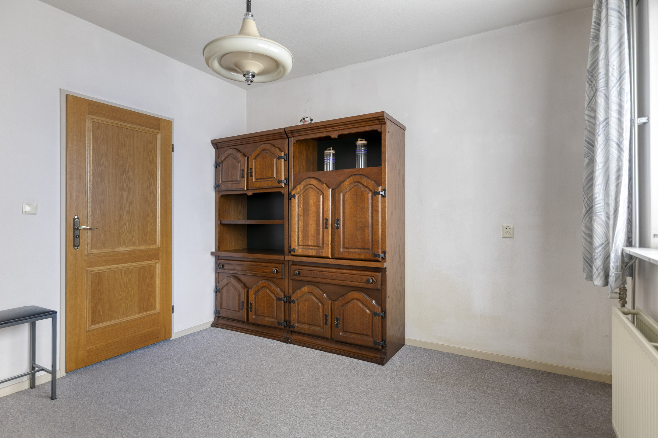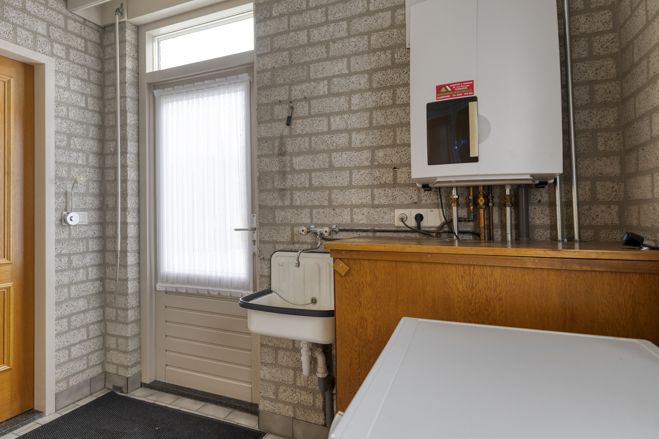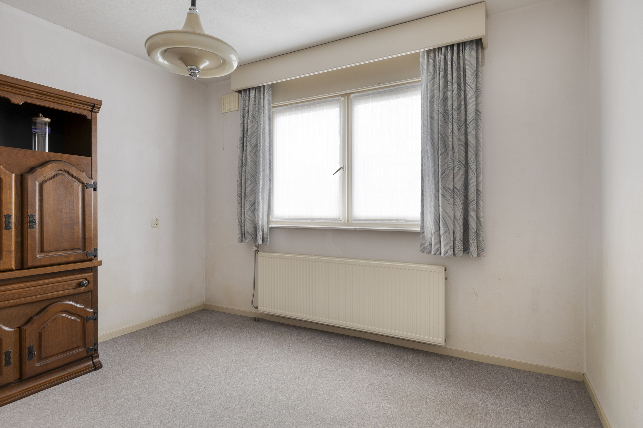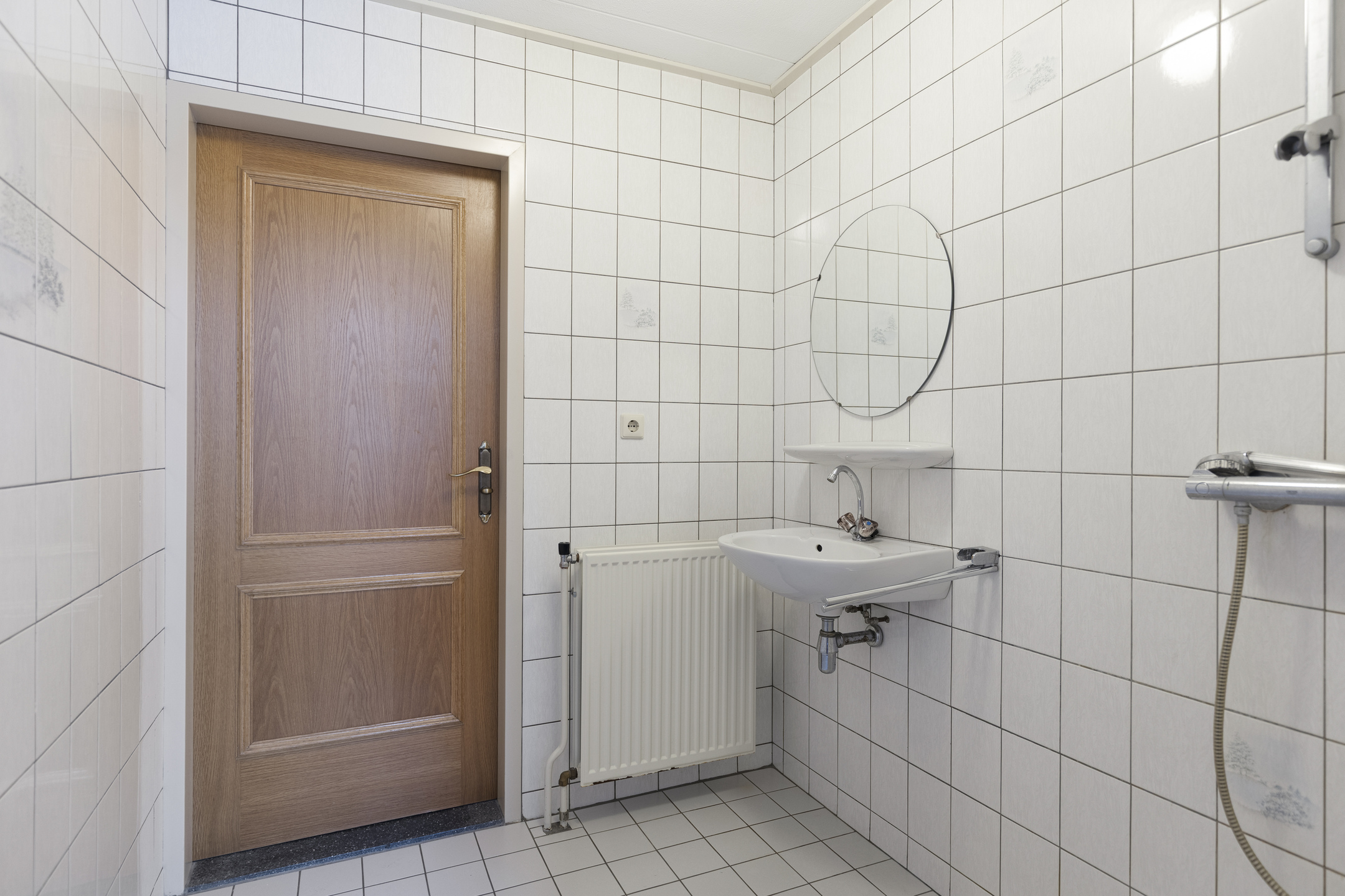 Begane grond: hal met meterkast. Een slaapkamer (kantoorruimte) met aansluitend een doucheruimte met wastafel en douche. De riante woonkamer is voorzien van grote raampartijen en openslaande tuindeuren, deze bieden een fraai uitzicht en veel lichtinval. Aparte woonkeuken met een nette keukeninrichting, bijkeuken met de opstelling van de cv-ketel en toilet met fonteintje.