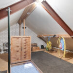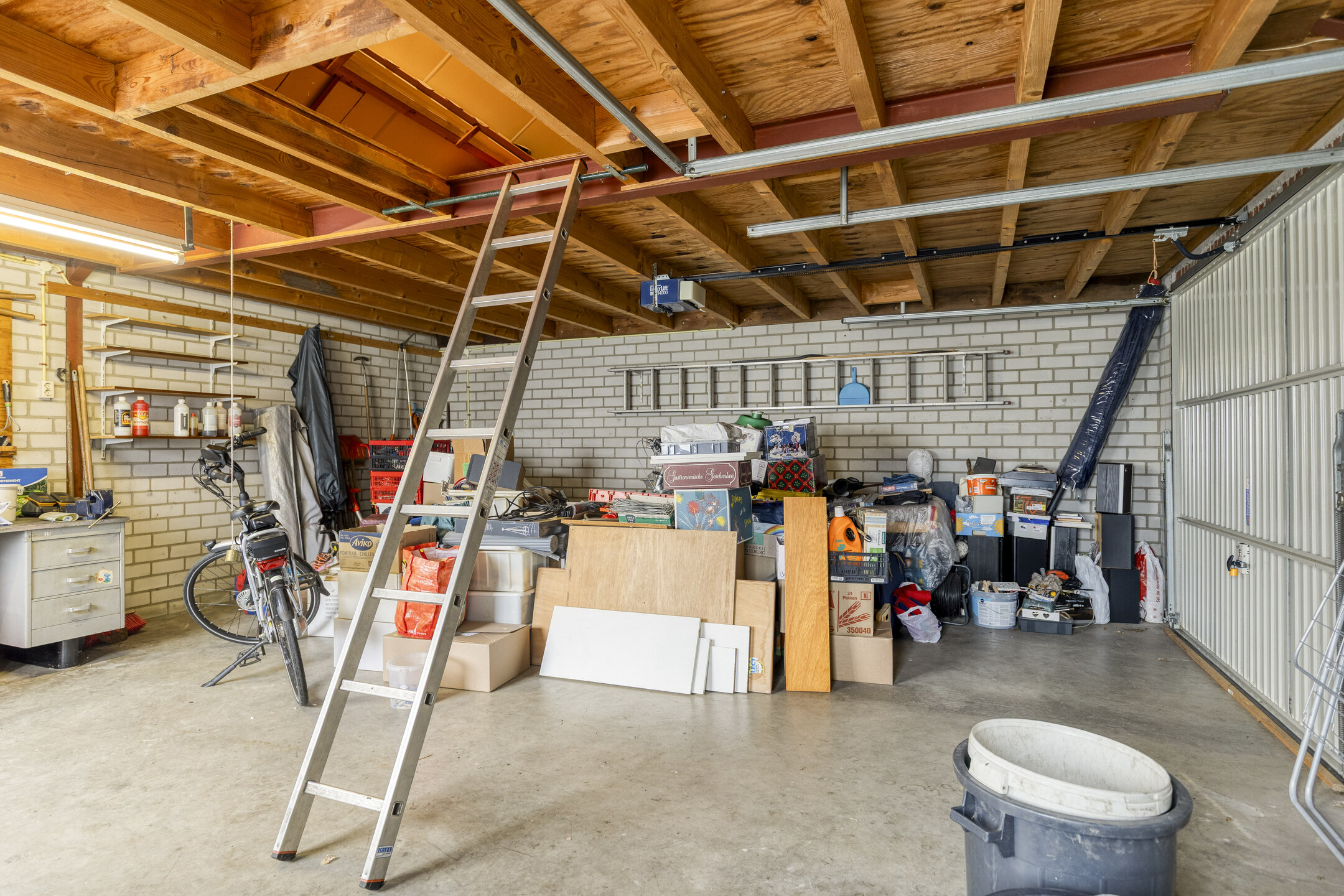 De zeer ruime, dubbele garage met zolderverdieping biedt vele gebruiksmogelijkheden.