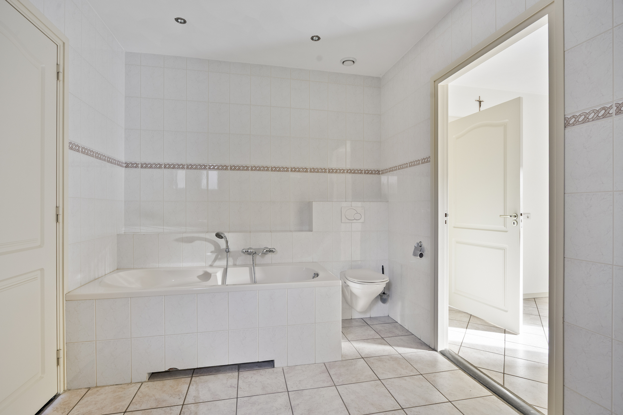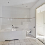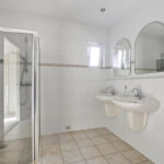 De badkamer op de begane grond is voorzien van een ligbad, douche, toilet en dubbele wastafel.