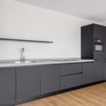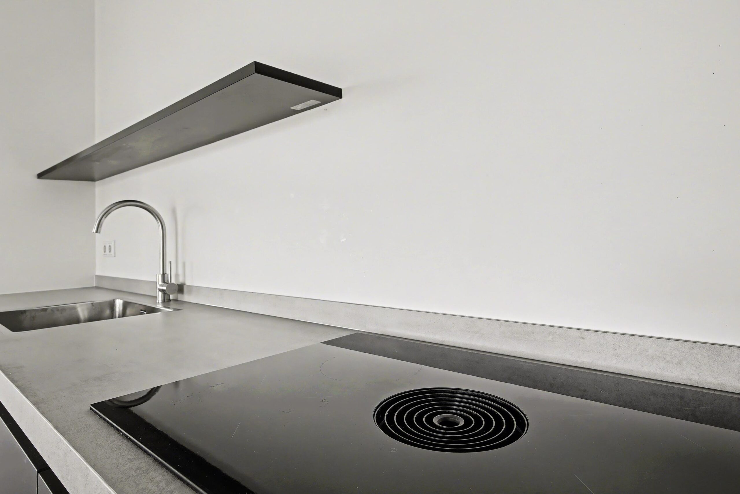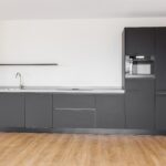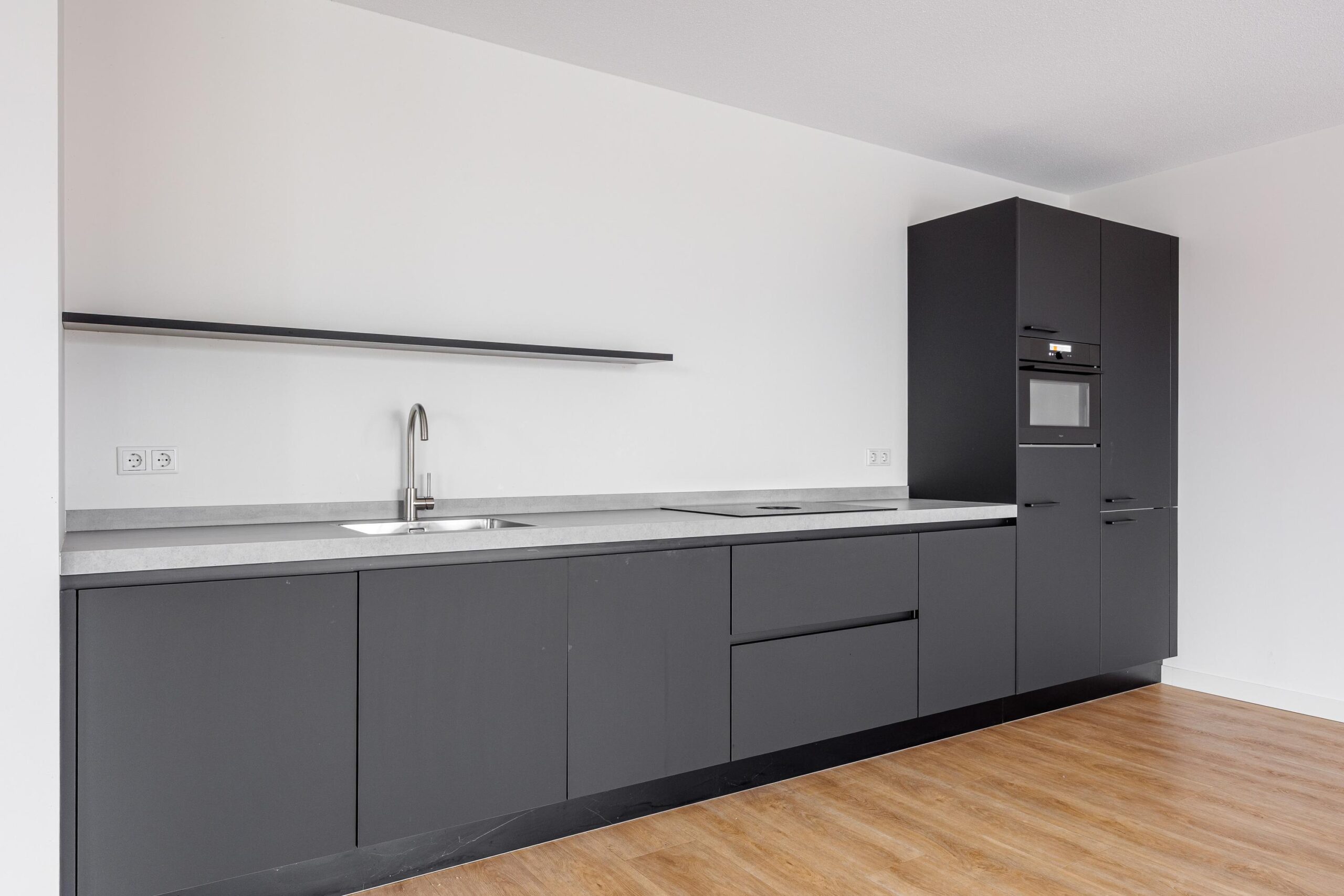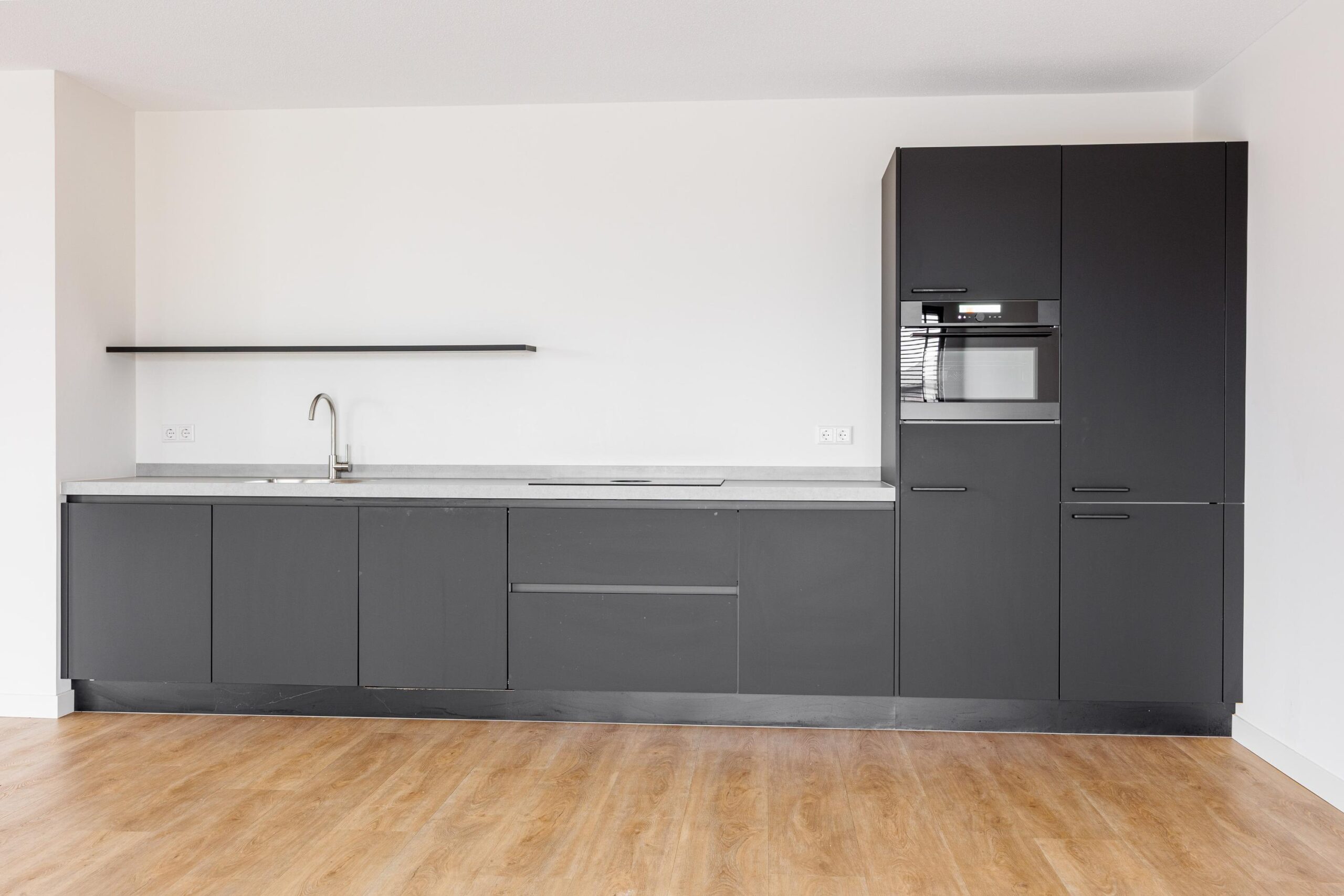 De keukenopstelling is voorzien van de volgende inbouwapparatuur: inductiekookplaat met een ingebouwd afzuigsysteem, koelkast, vriezer, combimagnetron en een vaatwasser.