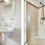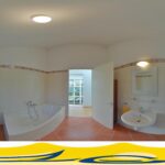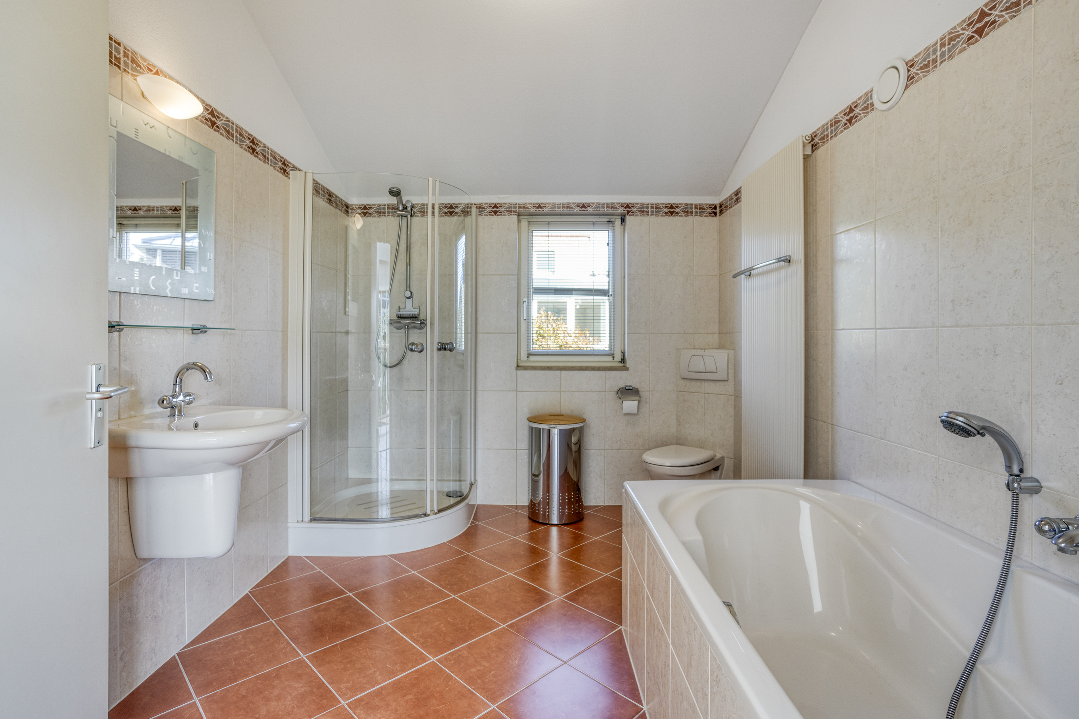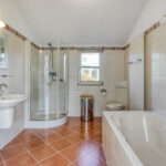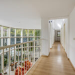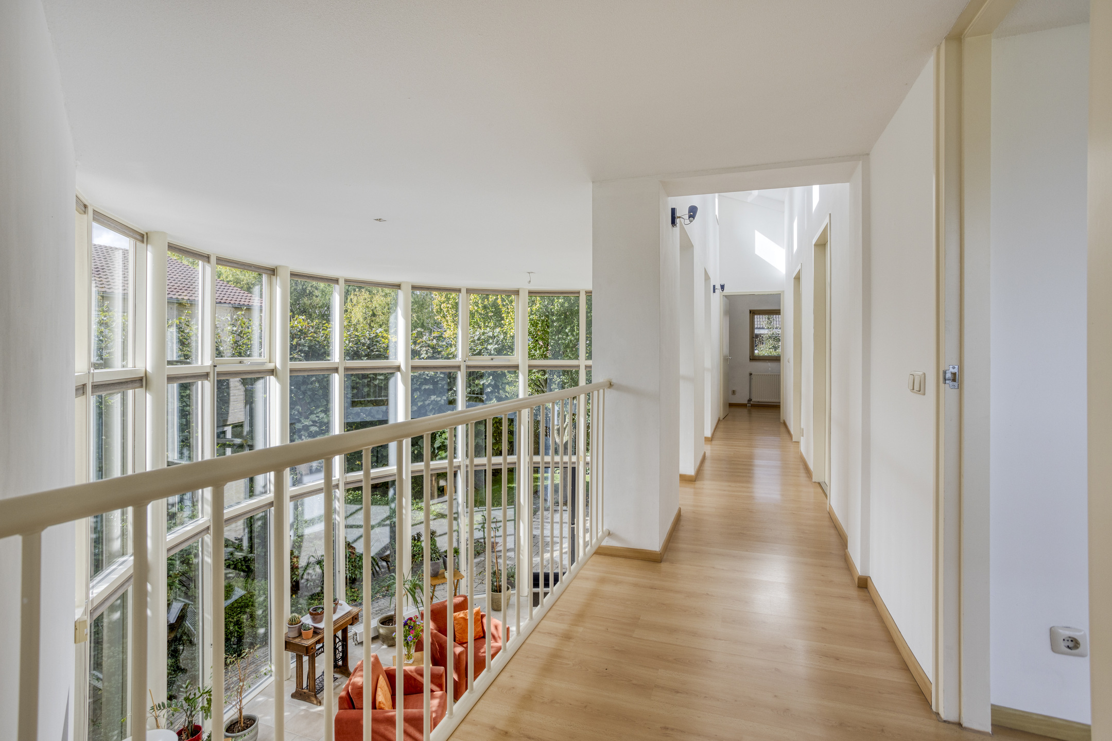 1 verdieping: overloop met vide, riante ouderslaapkamer van ca. 18 m², bergruimte met de opstelling van de cv-ketel, badkamer voorzien van een ligbad, douchecabine, designradiator, wandtoilet en vaste wastafel. En nog 2 slaapkamers van respectievelijk 10 en 11 m².