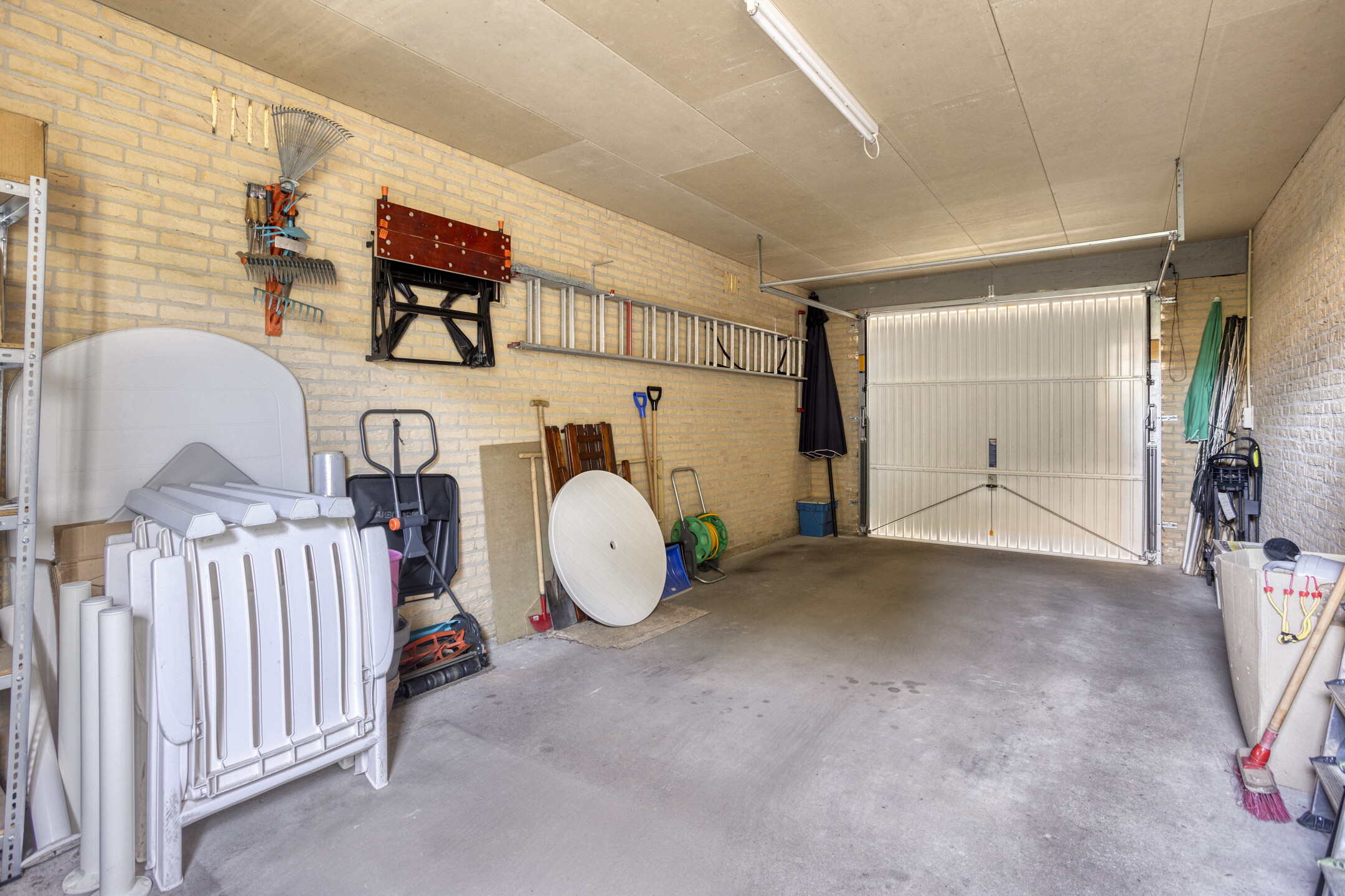 De riante aangebouwde garage biedt volop hobbyruimte en is voorzien van elektra.