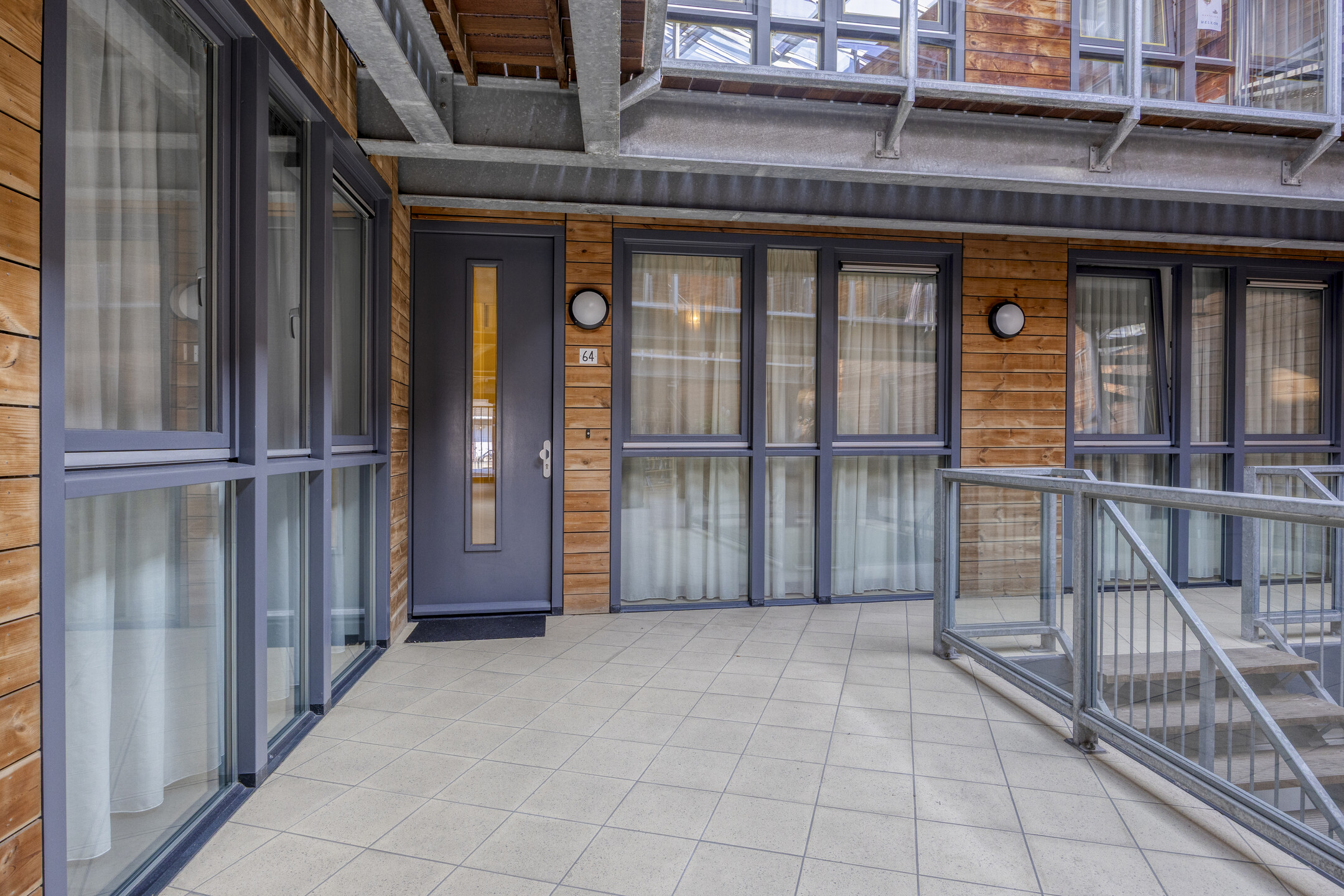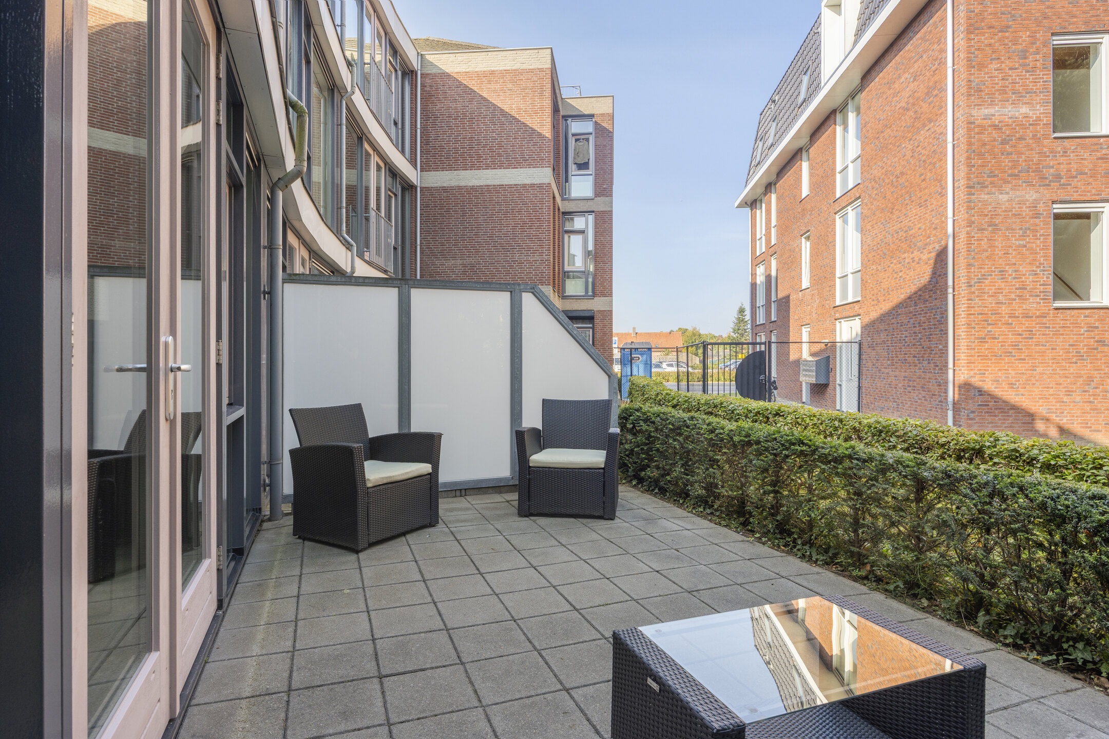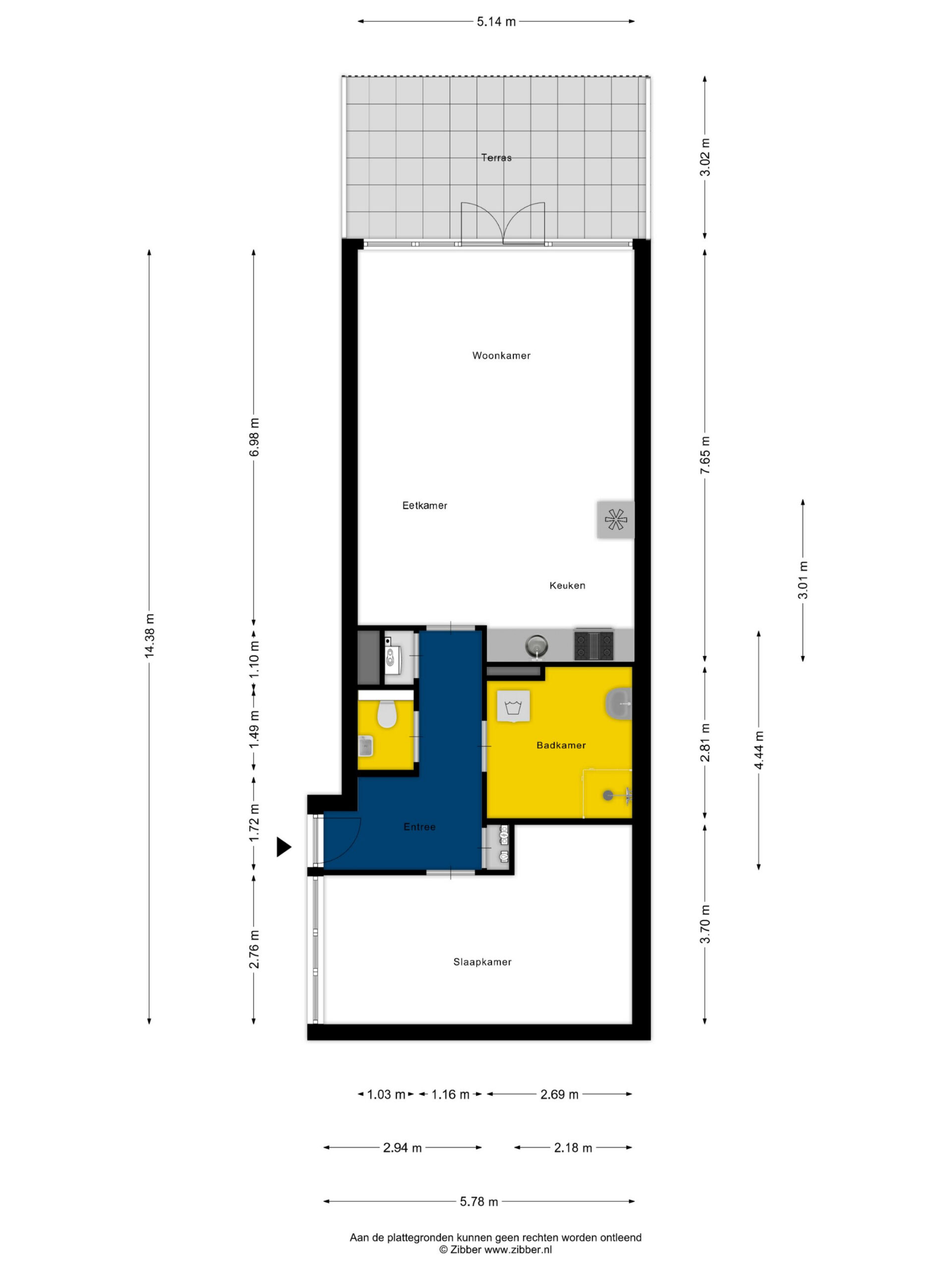 Eigen entree/ hal met toilet, ruime slaapkamer, badkamer voorzien van een douche, vaste wastafel en wasmachine-aansluiting. Woonkamer met een open keuken, voorzien van diverse inbouwapparatuur. Via de openslaande deuren in de woonkamer kom je op het privé-gelegen terras.